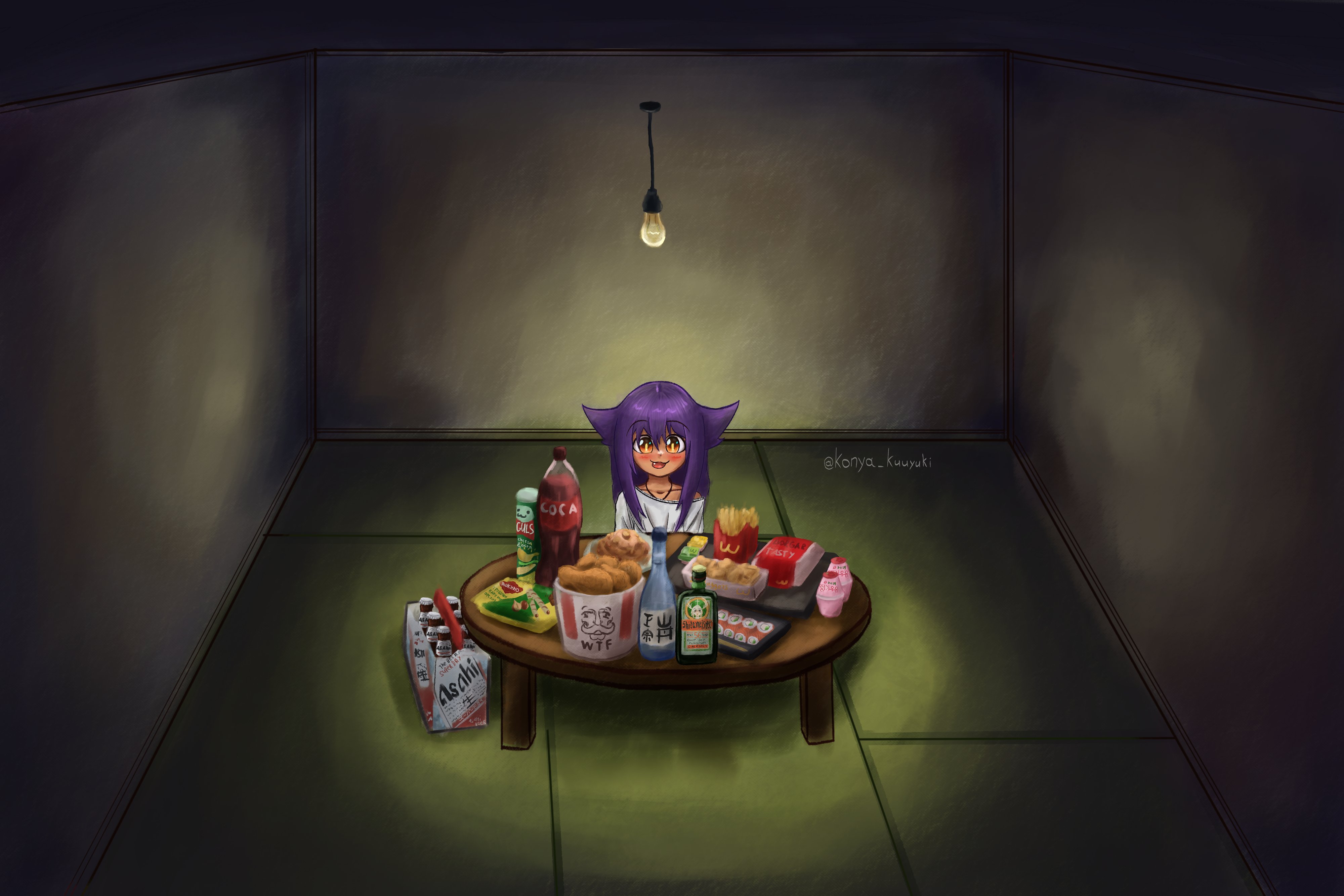 :31girldark skindark-skinned femaledarknessfangfoodkonya kuuyukiopen mouthpurple hairshirtsmilesolowhite shirtyellow eyes