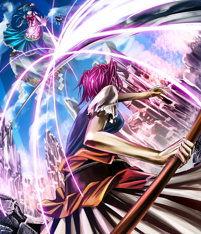 2girlsbattleblue hairfemale focuskaname-ishilong hairmultiple girlsred hairropescytheshimenawashort hair