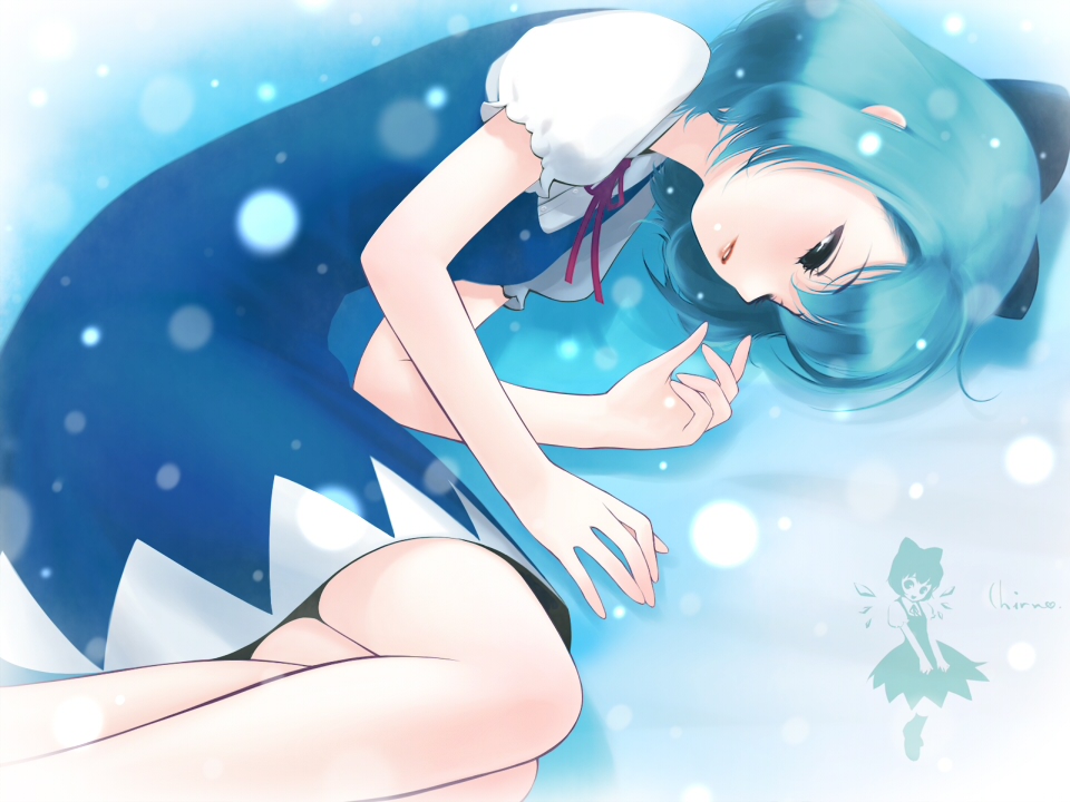 1girlblue hairbowbowtiedressfemale focusfetal positiongradient backgroundhair ribbonlipslyingribbonshort hairsnowsolowhite backgroundwings