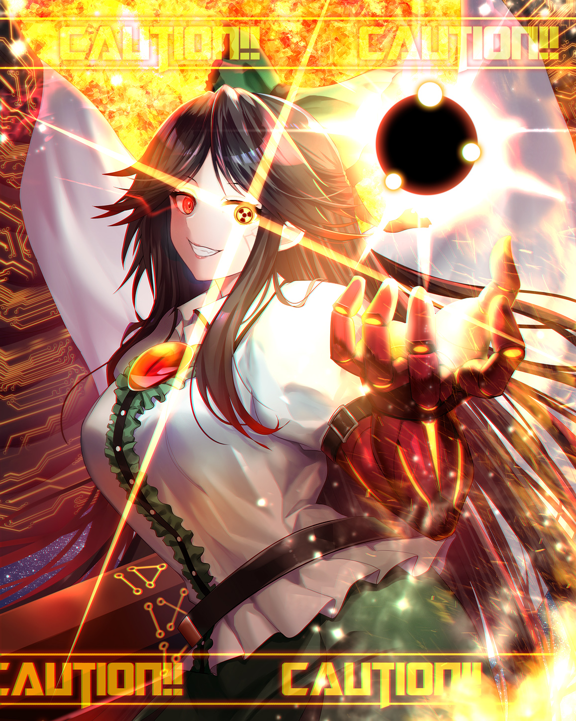 1girlarm cannonbeltblack beltblack hairblack sunblack wingsbowbreastscautioncenter frillscircuit boardcollared shirtcontrol rod (touhou)cowboy shotfrilled shirtfrillsgreen bowgreen skirtgrinhair bowheterochromialarge breastslong hairlooking at viewermechanical armsmechanical wingsradiation symbol-shaped pupilsred eyesshirtsingle mechanical armskirtsmilesolosunsymbol-shaped pupilsthird eyeweaponwhite shirtwings