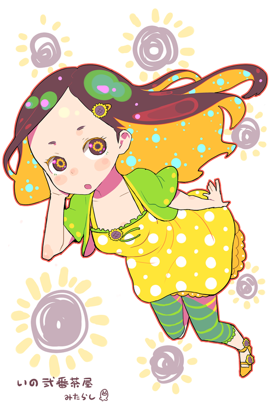 :o1girlblushbrown eyesbrown haircollarbonefemale focusfull bodyleggingslong hairlooking at viewerparted lipspolka dotshort sleevessolotareme