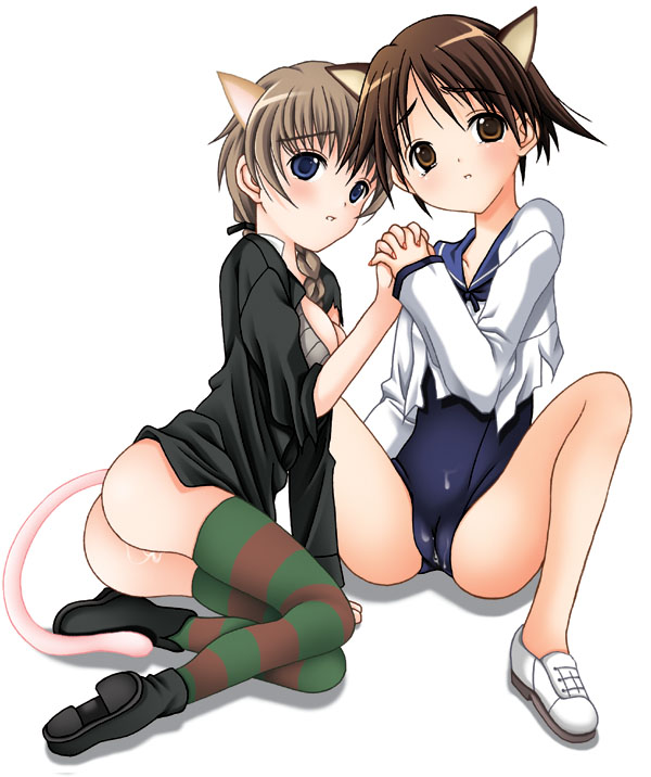 00s2girlsanimal earsblue eyesbrown eyesmultiple girlsschool swimsuitshoesshort hairswimsuittailthighhighs