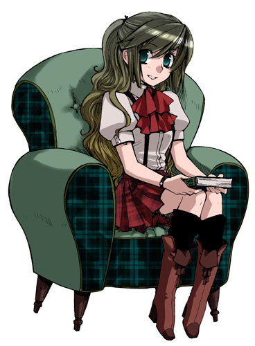 1girlarmchairascotblack socksblonde hairbookbootschaircouchfemale focusgradient hairgreen eyesgreen upholsterymulticolored hairpatterned upholsteryplaid clothesplaid skirtponytailred skirtshirtsimple backgroundsittingskirtsockssolosuspenderswhite shirt