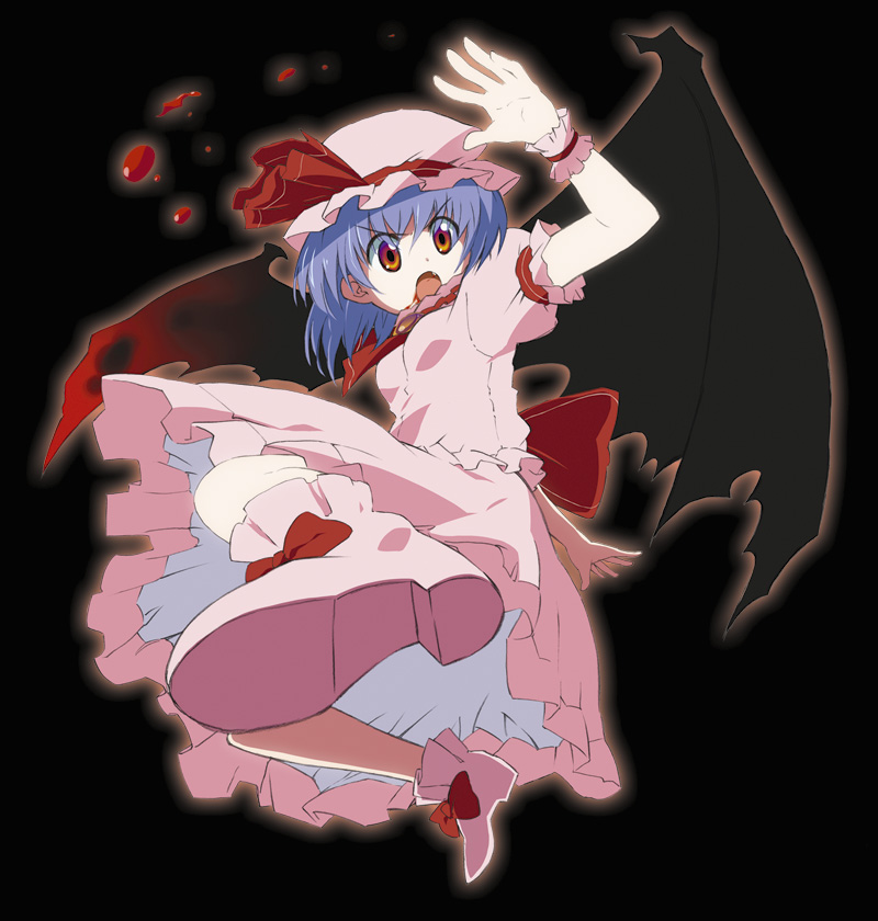 1girlbat wingsbloodblue hairbowdressfangfemale focusfull bodygradient backgroundhathat ribbonorange eyesribbonsolowings