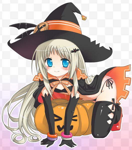 blonde hairbrabuttonscapefangflat chestgloveshalloweenhathigh heelslarge buttonslingerielong hairpantiespixiv thumbnailpumpkinribbonshoesthighhighsunderwearwitch hat