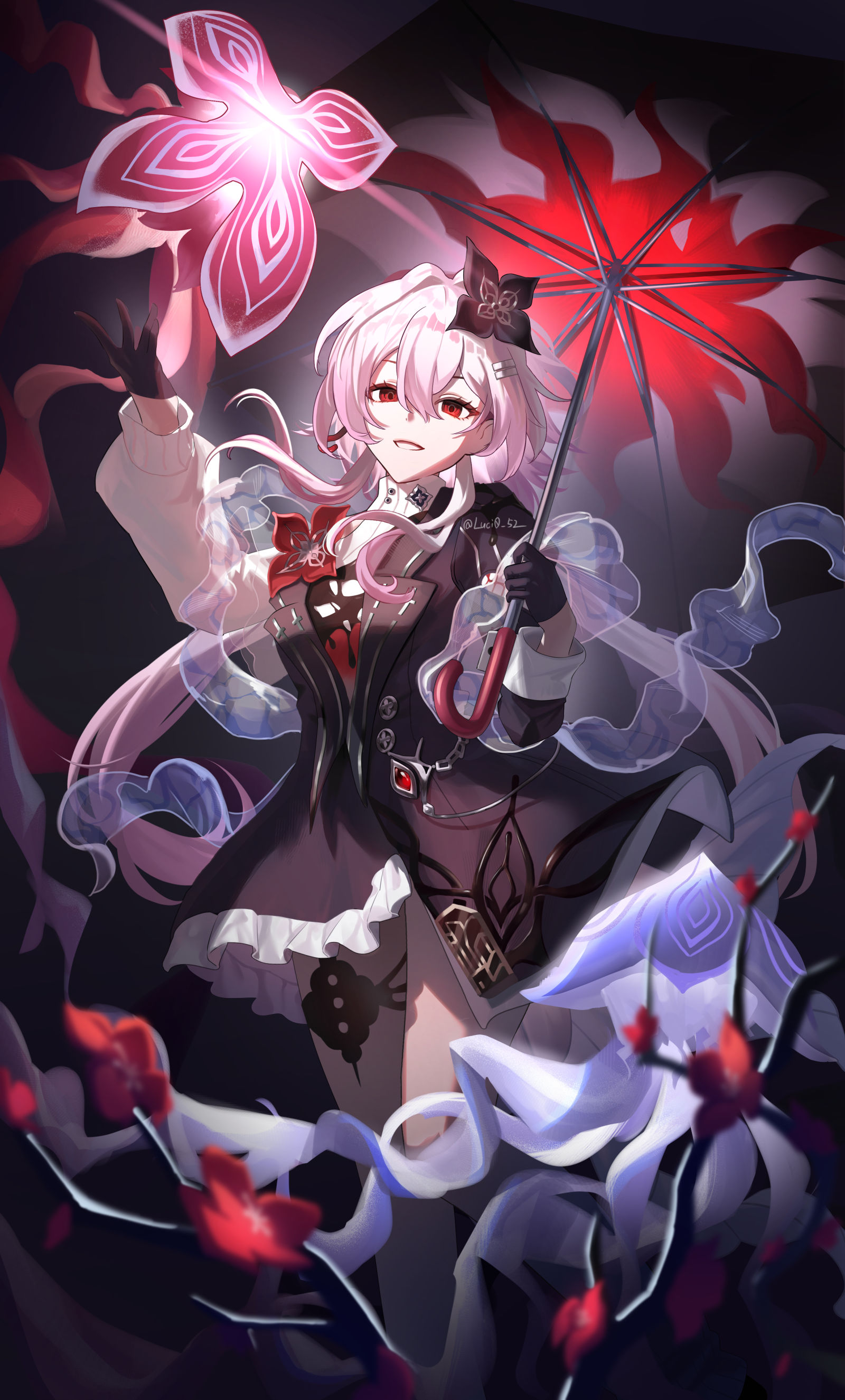 1girlblack dressblack flowerblack glovesbreastsdressflowergloveshair between eyeshair flowerhair ornamenthaircliphand upholdingholding umbrellalong hairlong sleevesmedium breastsparallel hairclipsparted lipspink hairred eyesred umbrellasmilesoloumbrellavery long hair