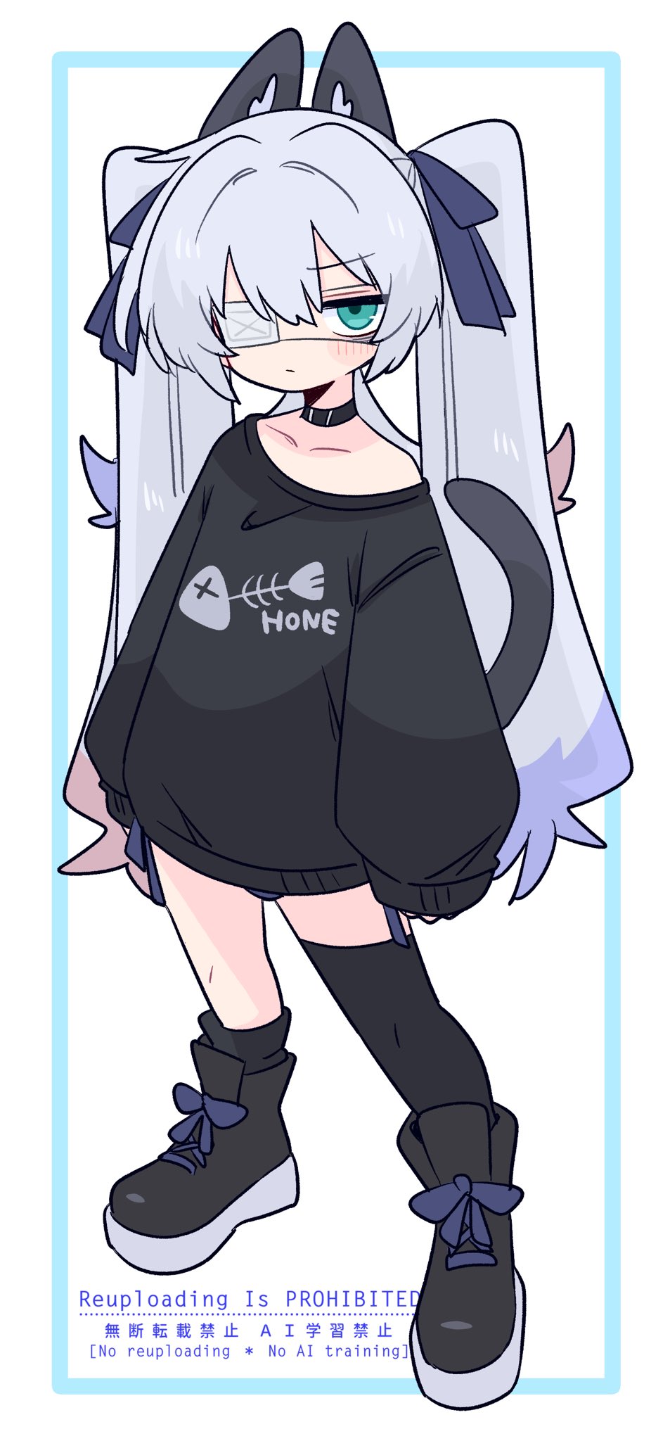 1boyanimal earsarms at sidesasymmetrical legwearblack chokerblack shirtblack shoesblack socksblack thighhighsblue bowblue eyesblushbowcat boycat earscat tailchokercollarboneexpressionlesseyepatchfish skeletonfull bodygrey tailhair between eyeshair bowlong hairlong sleeveslooking at viewermedical eyepatchmismatched legwearone eye coveredoversized clothesoversized shirtprint shirtpuffy sleevesrigel (op na yarou)shirtshoessidelockssimple backgroundsingle off shouldersingle thighhighsleeves past fingerssleeves past wristssockssolostandingtailthighhighstwintailsv-shaped eyebrowsvery long hairwatermarkwhite backgroundwhite hair