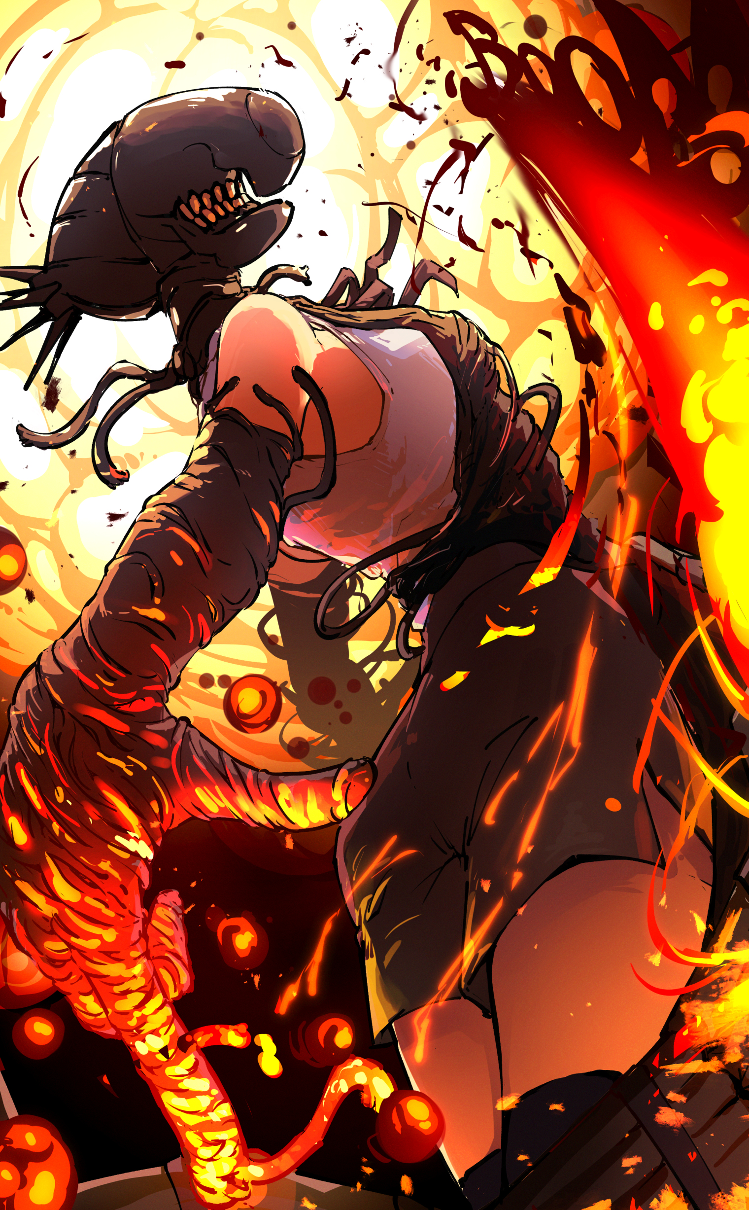 1girlapronblack apronblack glovesblack shortsbreastsdynamiteelbow glovesexplosionexplosion backgroundexplosiveglovesgradient glovesobject headred glovesshirtshortssleevelesssleeveless shirtsmall breastssolowhite shirt