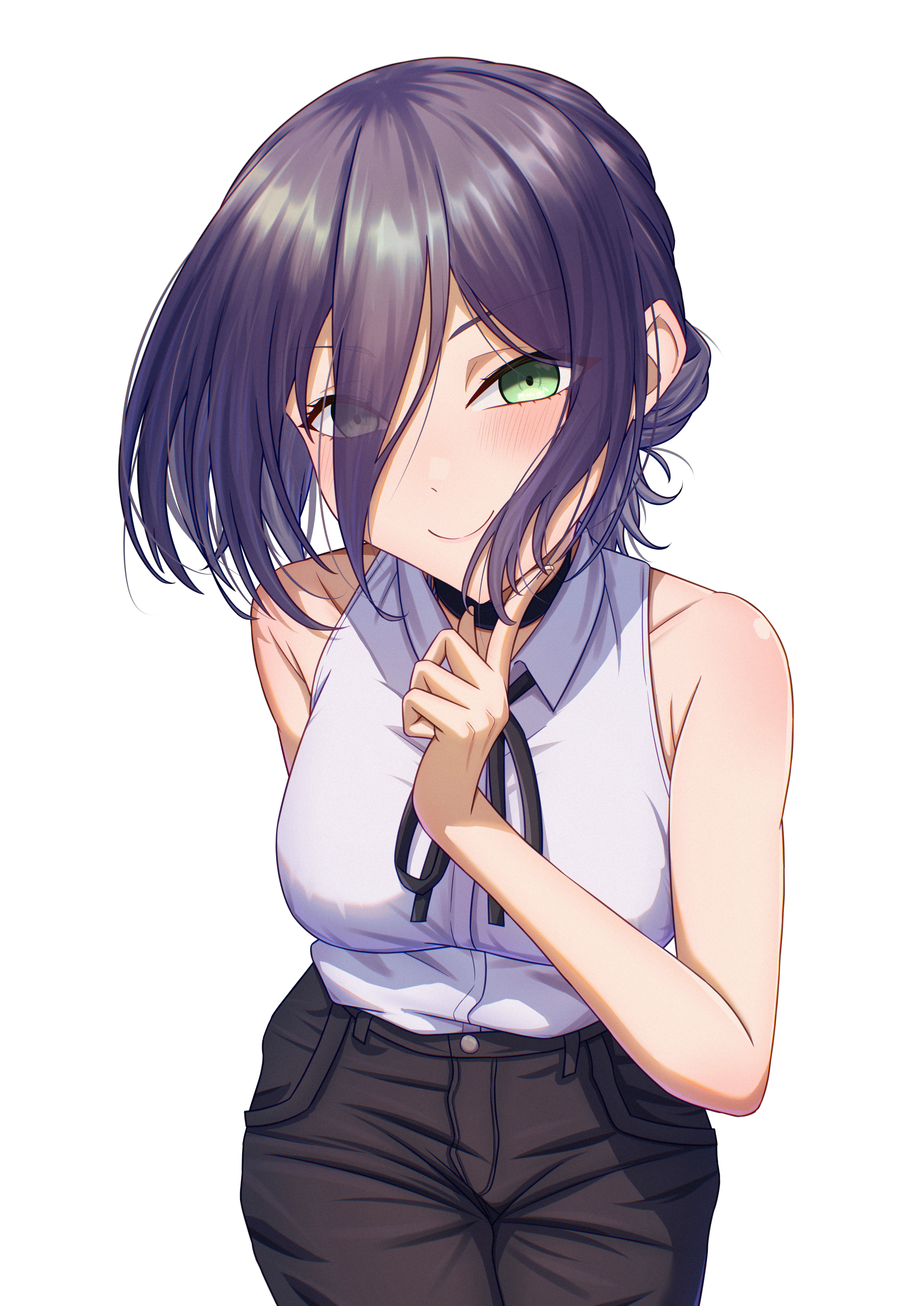 1girlblack hairblack ribbonblack shortsclosed mouthcollared shirtgreen eyeshair bunhand on own chinleaning forwardlooking at viewerneck ribbonribbonshirtshirt tucked inshortssimple backgroundsleevelesssleeveless shirtsmilesolowhite backgroundwhite shirt