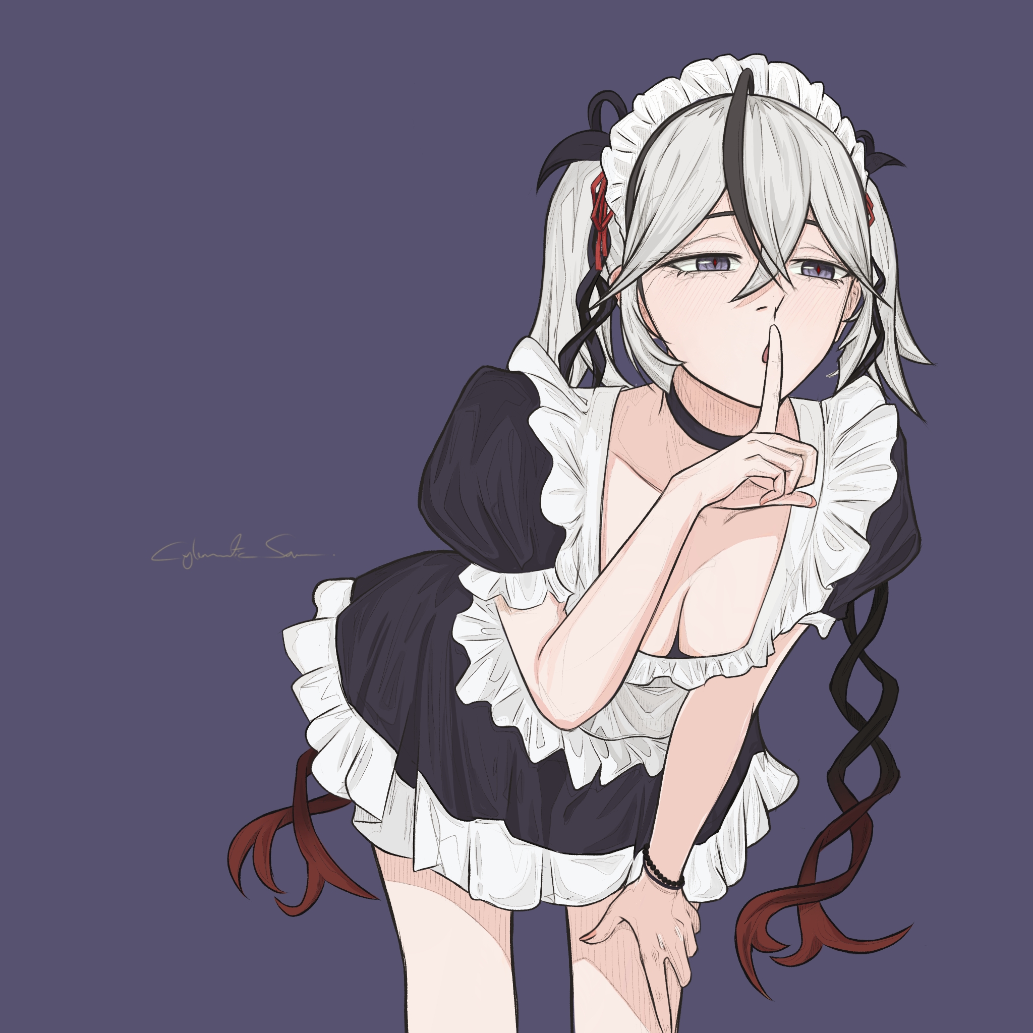 1girlalternate costumeblack chokerblack dressblack eyesbreastschokercleavagecollarbonedressenmaidedfinger to mouthfingernailshair between eyeshair vinesindex finger raisedleaning forwardlooking aheadmaidmaid headdressmedium breastspurple backgroundred pupilsshort hairshort twintailsshushingsignaturesolotwintails