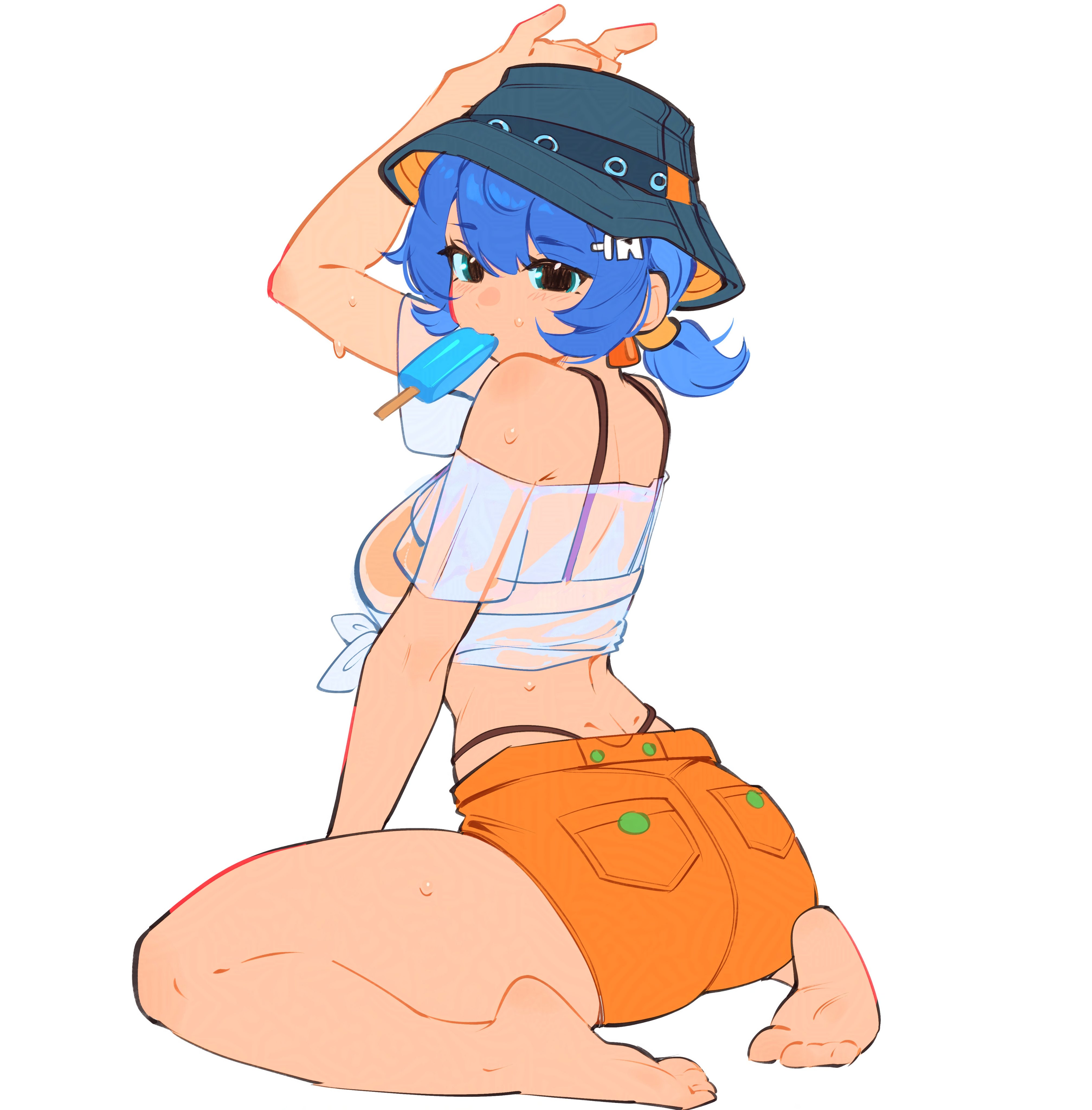 1girlassbarefootbikinibikini under clothesblack hatblue hairbowlbowl hatbreastsearringsfoodfood in mouthfull bodyhair ornamenthand on own headhatjewelrylooking at viewermedium breastsoff shoulderoff-shoulder shirtofficial alternate costumeorange hairorange shortspopsiclepopsicle in mouthsee-through clothessee-through shirtshirtshort hairshortssimple backgroundsittingsoloswimsuittied shirtwarizawhite backgroundwhite shirt