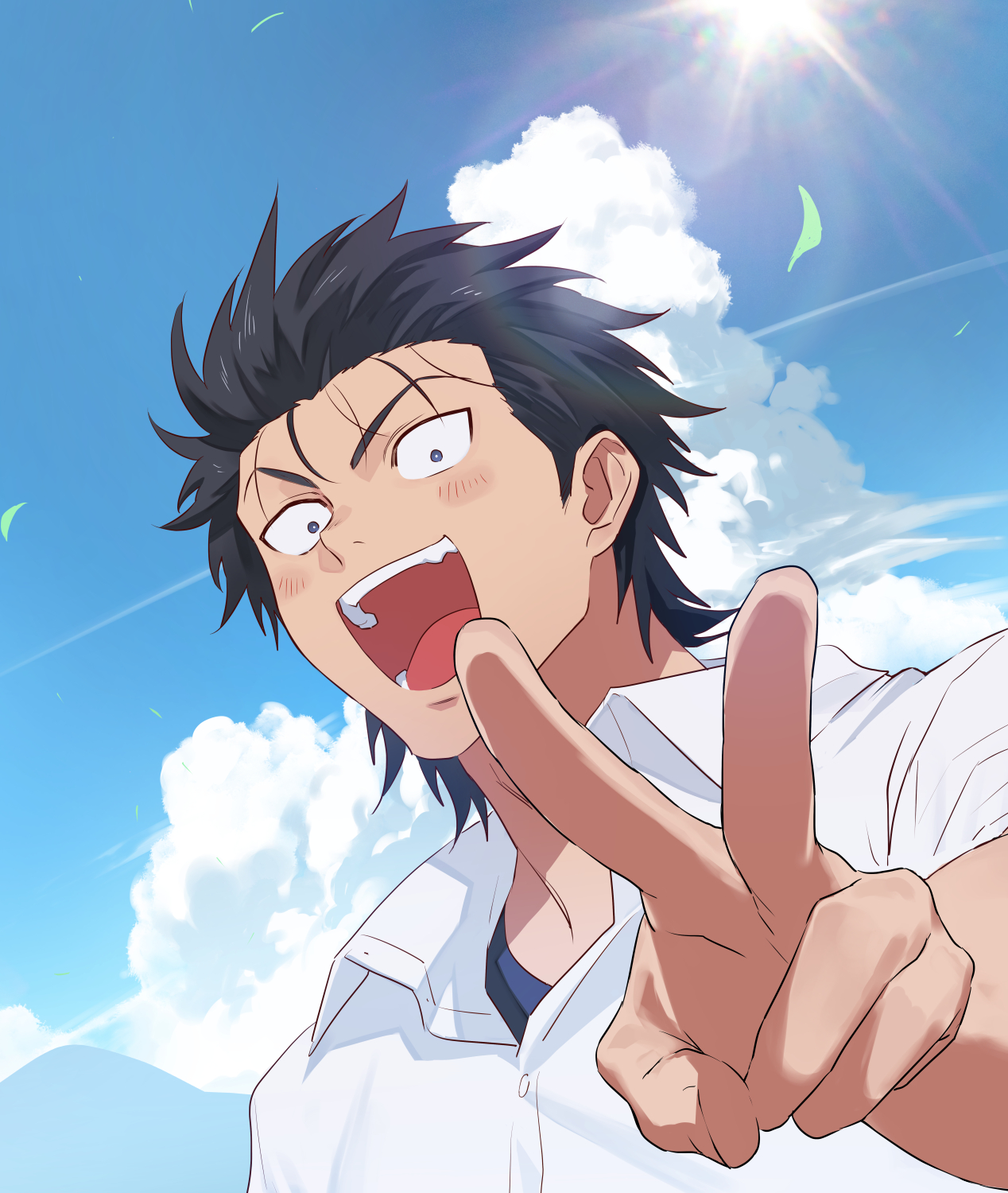 1boyblack hairblue shirtblue skycloudcollared shirtlooking at viewermale focusopen mouthshirtshort hairskysmilesolosunsunlightteethupper bodyvwhite shirtyamato (haiki)