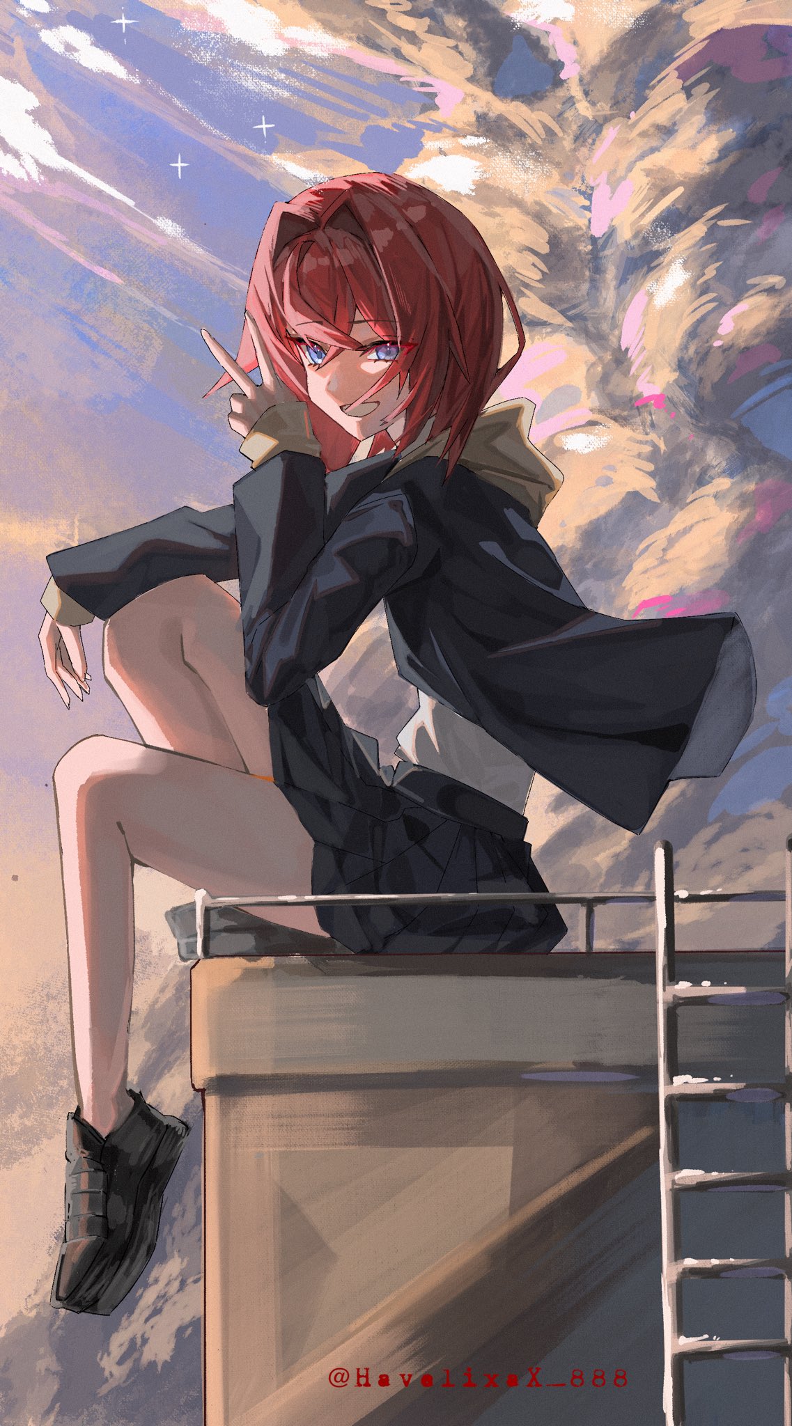 1girlalternate costumearm on kneebare legsblack jacketblack shoesblack skirtblue eyescloudcloudy skycrossed bangsfrom sidefull bodygrinhair between eyeshair intakeshand uphoodhood downinward vjacketknee uplong sleeveslooking at viewerlooking to the sidemedium hairminiskirtno socksopen clothesopen jacketoutdoorspleated skirtpurple skyred hairshirtshirt tucked inshoessittingskirtskysmilesolostar (sky)sunsetturning headtwitter usernamevvirtual youtuberwater towerwhite shirt