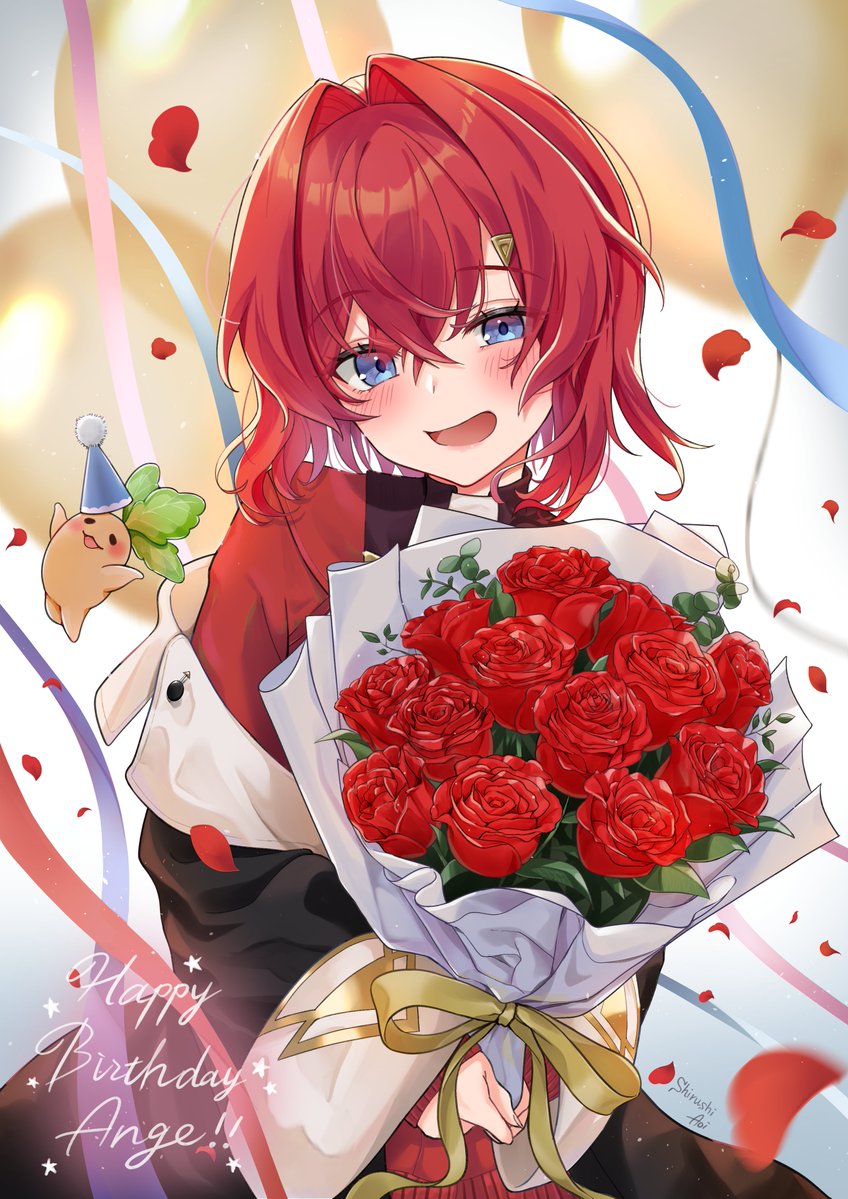 1girlartist nameballoonbirthdayblack coatblue eyesblushbouquetcardigancharacter namecoatcrossed bangsenglish textfalling petalsflowerhair between eyeshair intakeshair ornamenthappy birthdayhatholdingholding bouquetlipslooking at viewermedium hairoff shoulderopen mouthparty hatpetalsred cardiganred flowerred hairred petalsred roseribbonrosesleeves past wristssmilesolostreamerstriangle hair ornamentupper bodyvirtual youtuberyellow ribbon