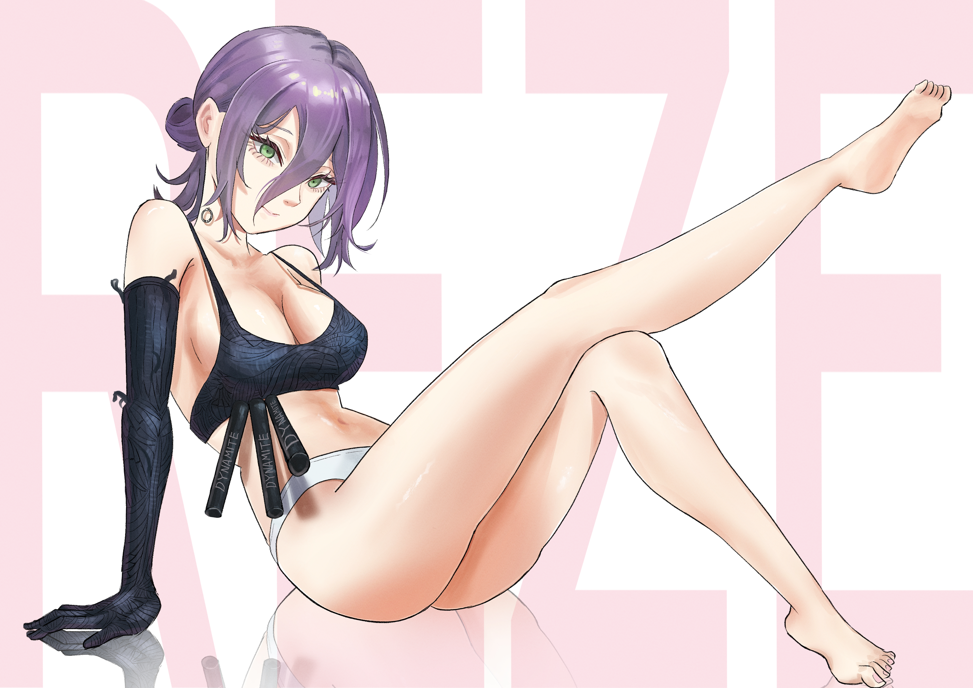 1girlbarefootbikiniblack bikiniblack glovesbreastsclosed mouthelbow glovesfeetfoot upglovesgreen eyesgrenade pinhair between eyeshair bunmedium breastspantiespurple hairreflective floorsmilesoloswimsuitunderwearver min27white panties