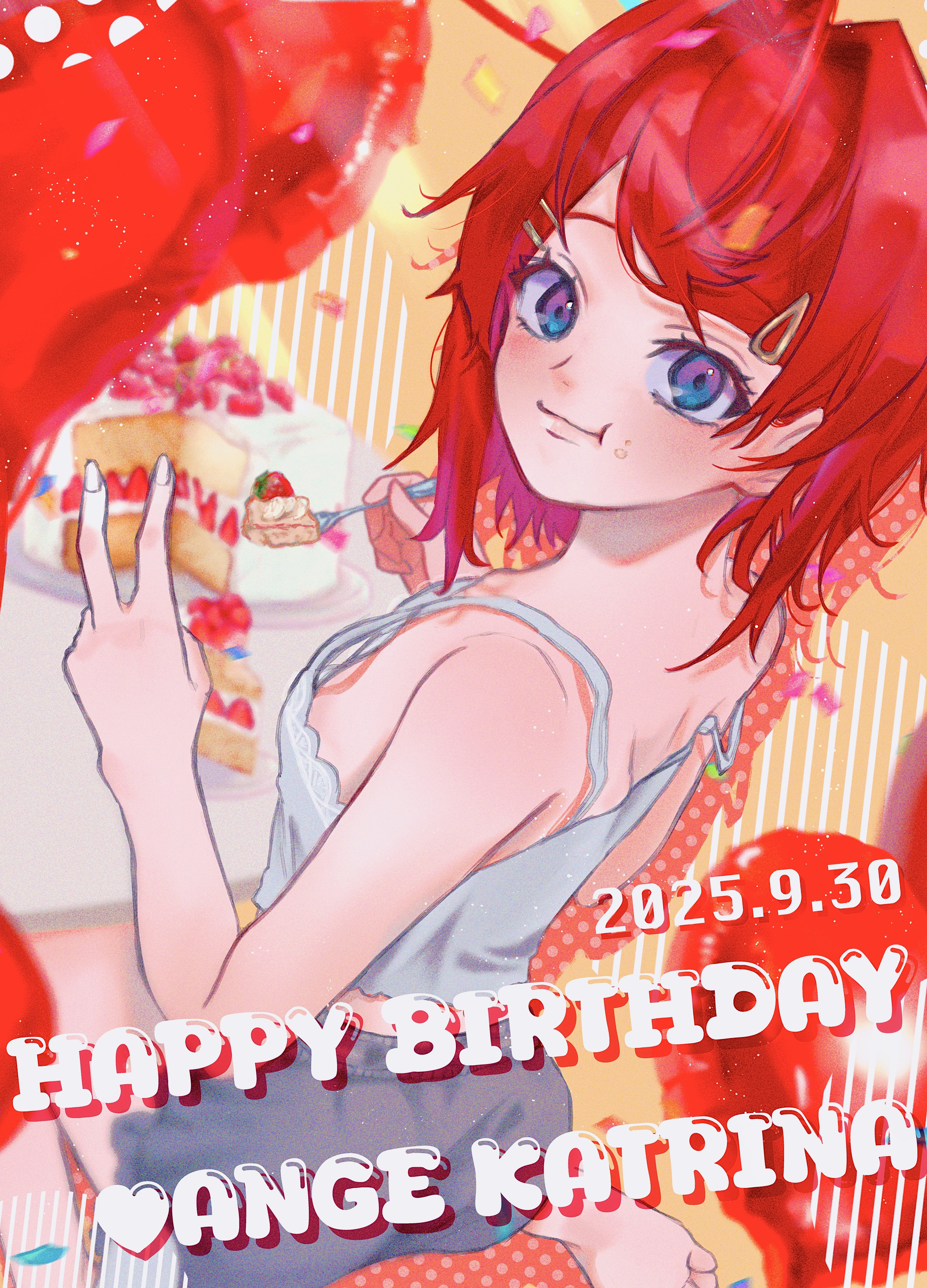 :t1girlballoonbare shouldersbarefootbent vbirthdaybirthday cakeblue eyesblurryblurry backgroundblushbreastscakecamisolecharacter nameclosed mouthdateddepth of fieldeatingenglish textfoodfood on facefoot out of frameforkfrom behindgradient eyesgrey shortshair intakeshair ornamenthaircliphands uphappy birthdayholdingholding forklayer cakelooking at viewerlooking backmedium hairmulticolored eyesnachunopurple eyesred hairshort shortsshortssittingsmall breastssolostrap slipstrawberry shortcaketableturning headvvirtual youtuberwarizawhite camisoleyellow background