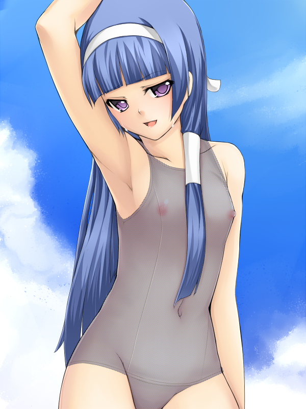 00s1girlarm uparmpitsblue hairblunt bangscollarbonecontrappostodayfemale focusfishnet swimsuitfishnet topfishnetshair ribbonhair tubeslong hairlooking at viewernavelnipplesparted lipspurple eyesribbonsee-through clothesskysmilesmugsolostandingswimsuitvery long hairwhite ribbon