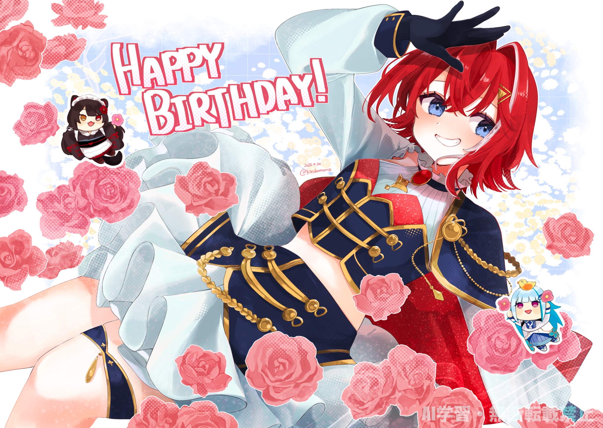3girlsaiguillettearm supportarm upblack glovesblue backgroundblue capeblue eyesblue shirtblue skirtblushbreastscapechibiclothing cutoutcrossed bangsdatedenglish textfeet out of frameflowerfrilled skirtfrillsgemglovesgold trimgrid backgroundgrinhair between eyeshair intakeshair ornamenthalftonehappy birthdayidol clotheslayered shirtlayered skirtleaning backlong sleeveslooking at viewermedium hairmidriffminiskirtmulticolored hairmultiple girlsnijisanji idol uniformpink flowerpink rosepuffy long sleevespuffy sleevesred capered gemstonered hairrosesanbaka (nijisanji)shirtshoulder cutoutside capeskirtsleeve cuffssmall breastssmilestreaked hairthigh straptriangle hair ornamenttwitter usernametwo-sided capetwo-sided fabrictwo-tone hairvirtual youtuberwatermarkwhite hairwhite shirtwhite skirtyellow flower