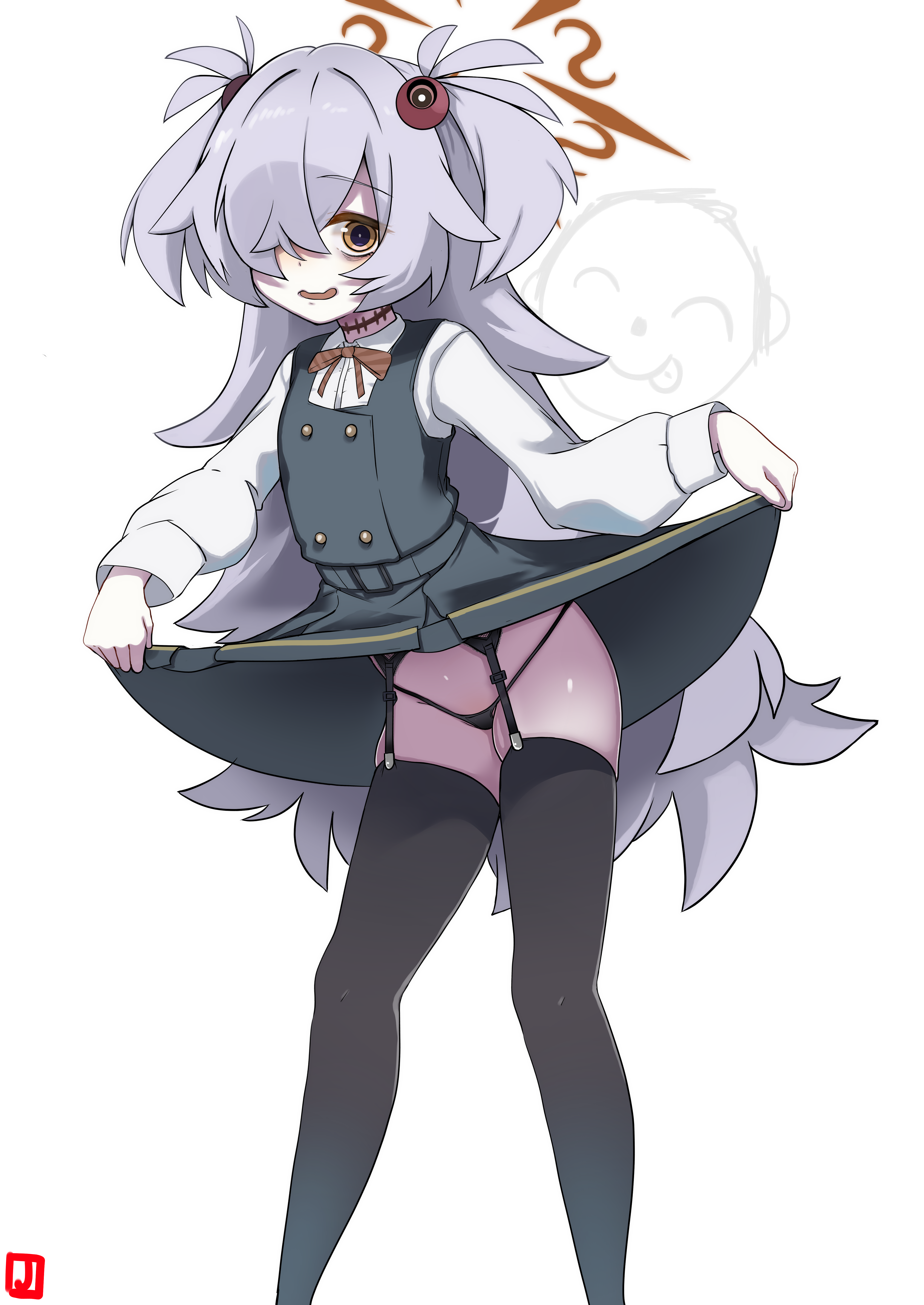 1girlalternate legwearbags under eyesblack dressblack garter beltblack pantiesblack thighhighsbrown eyesbrown haloclothes liftdressdress liftfeet out of framegarter beltgrey hairhair over one eyehalolong hairlong sleevesopen mouthpantiespinafore dresspuffy long sleevespuffy sleevesshirtsimple backgroundsleevelesssleeveless dresssolostandingstring pantiesthighhighstwo side upunderwearvery long hairwhite backgroundwhite shirt