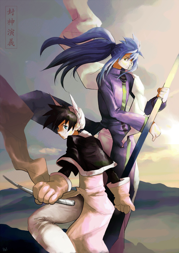 1990s (style)2boysblack hairblue hairgloveslong hairmale focusmultiple boyspolearmponytailrobeshort hairspeartridentweapon