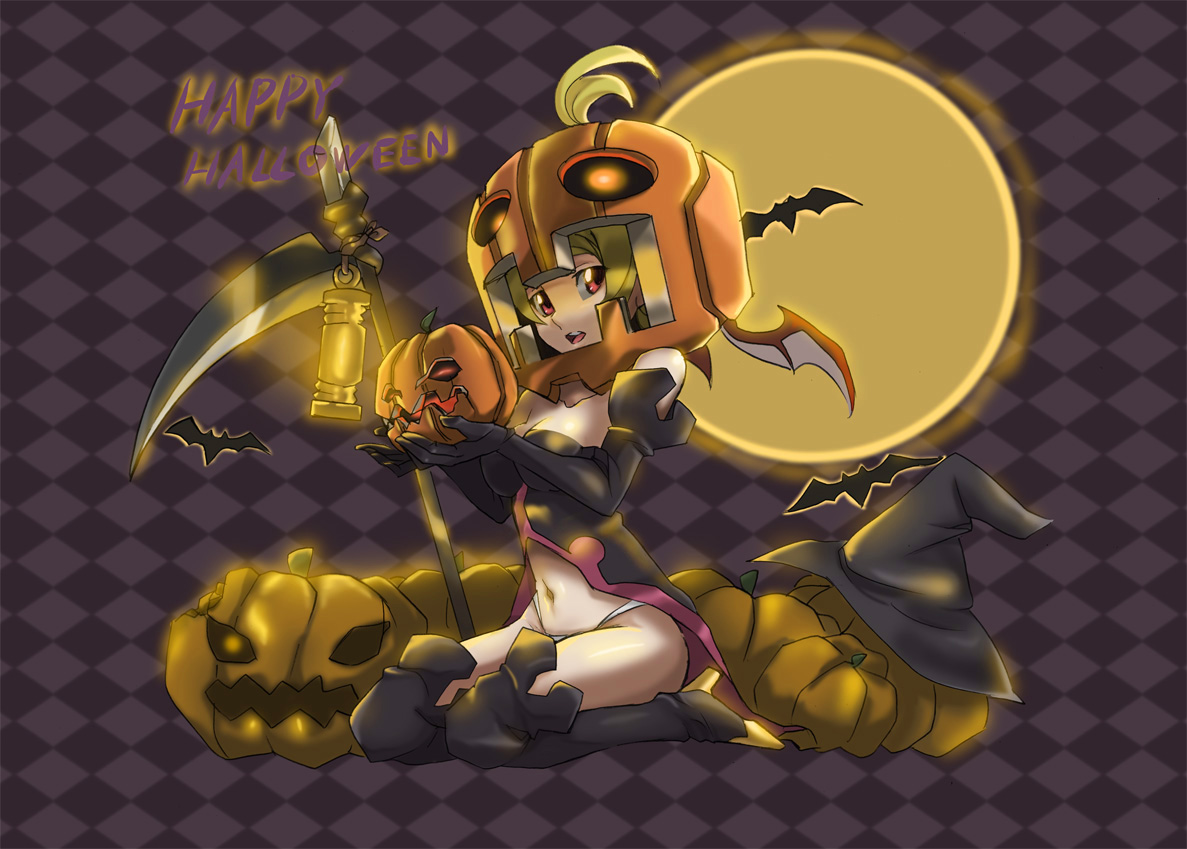 1girlbat (animal)bootsfemale focushalloweenhappy halloweenhatjack-o'-lanternkneelingmoonpumpkinpumpkin hatred eyesscythesolothigh bootsthighhighswitch hat