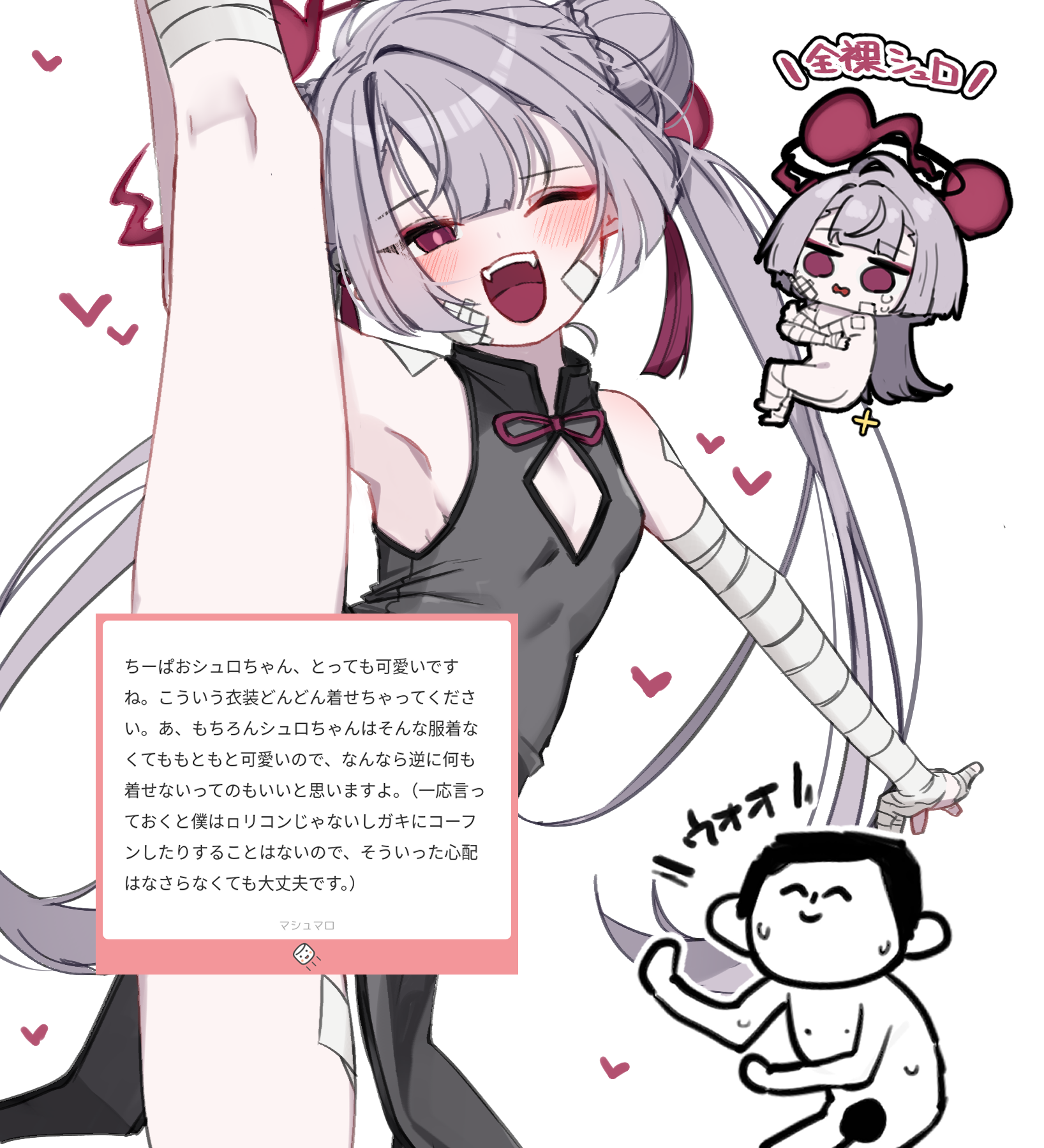 :d1boy1girlalternate costumealternate hairstylearm uparmpitsbandaged armbandaged legbandagesblack dressblushbreastscensoredchibichibi insetchina dresschinese clothescleavage cutoutclothing cutoutdouble bundresseyeshadowgrey hairhair bunhaloheartkneepitsleg uplong hairlooking at viewermakeupmarshmallow (site)no pantiesnovelty censorone eye closedopen mouthoutstretched armpelvic curtainred eyesred eyeshadowred halosleevelesssleeveless dresssmall breastssmilesplitstandingstanding on one legstanding splittwintailswhite background