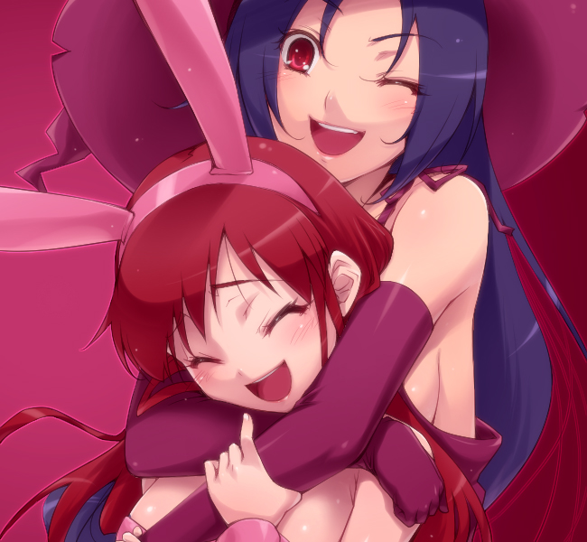 animal earsblue hairbreastsclosed eyeselbow glovesgloveshatlong hairrabbit earsred eyesred hairsideboobwinkwitch hat