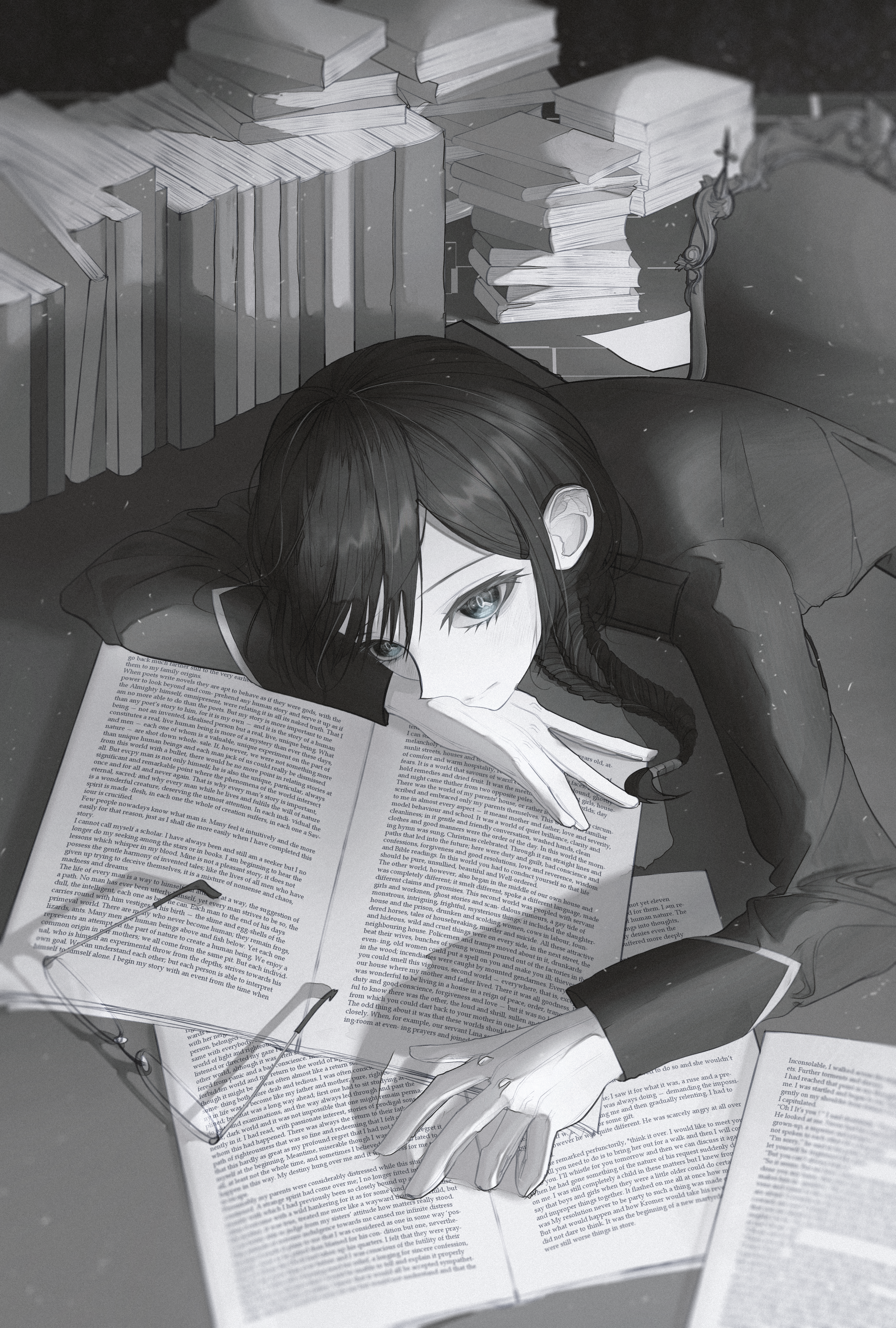 1girlblack eyesblack hairblue butterflyblue eyesbookbookshelfbraidbraided ponytailbugbutterflycollared jacketcollared shirtdeskglassesglovesgrey eyesgreyscalehair between eyesinsectjacketlong hairlooking at viewerlyingmonochromeon deskon stomachpapershirtsingle braidsittingsoloundershirtwhite gloves