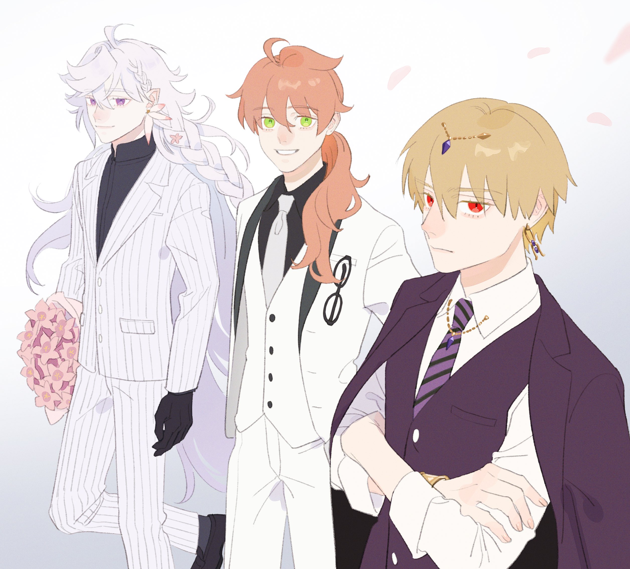 3boysblack glovesblack jacketblack shirtblack shoesblack socksblack vestblack-framed eyewearblonde hairbouquetbraidcollared shirtcrossed armsearringseyes visible through haireyewear hangfalling petalsflowerformal clothesfrownglassesglovesgradient backgroundgreen eyesgrey necktiegrinhair between eyeshair over shoulderhigh collarholdingholding bouquetjacketjacket on shouldersjewelryleg uplong hairlooking at viewermale focusmultiple boysnecktieorange hairpantspetalspink flowerponytailpurple eyespurple necktiered eyesshirtshoesshort hairside braidsmilesocksstriped clothesstriped jacketstriped necktiestriped pantsunworn eyewearvery long hairvestwhite backgroundwhite jacketwhite pantswhite shirtwhite vestwing collar