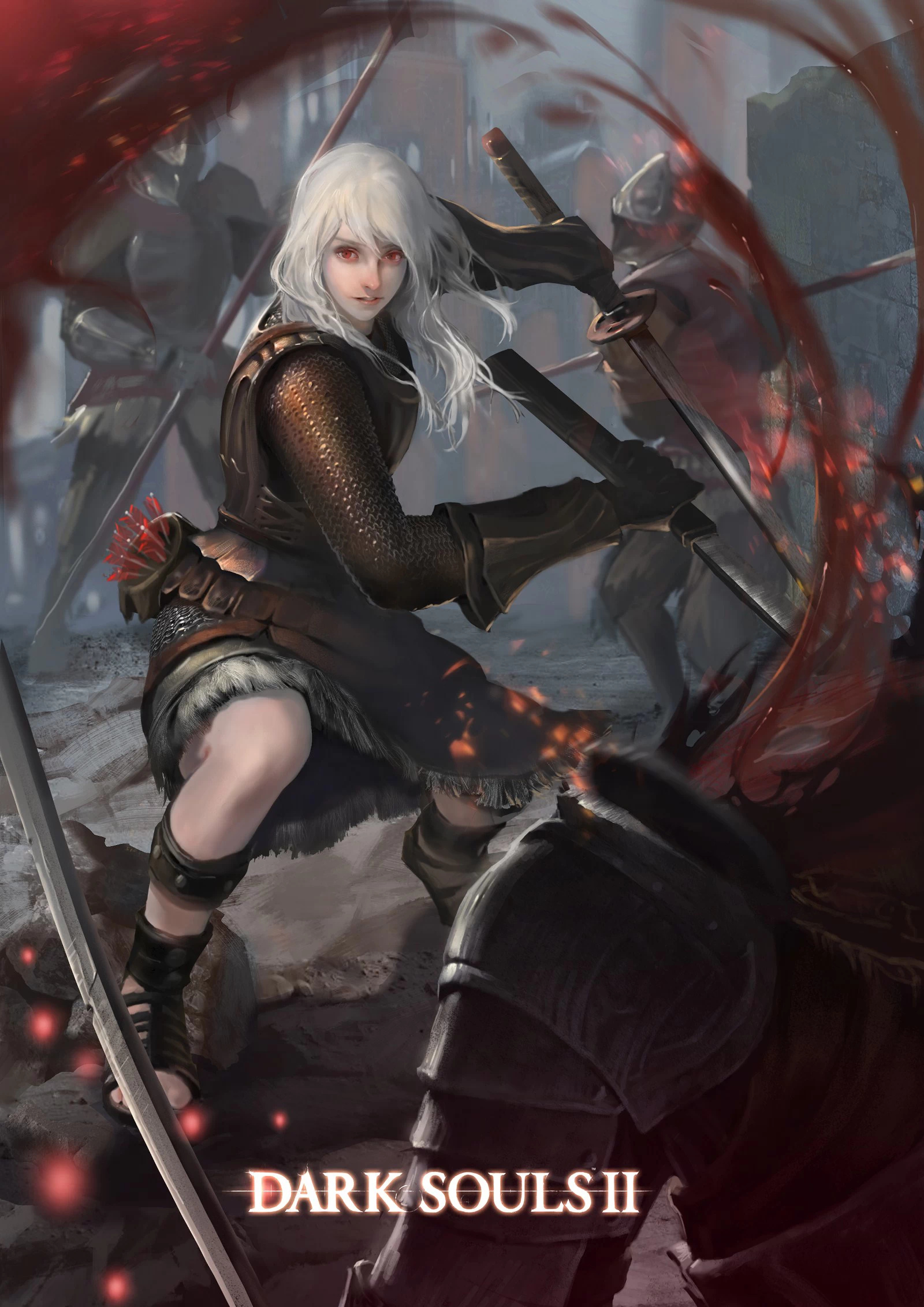1girl3boysarmorarrow (projectile)beltblack glovesblack sandalsbloodblood splatterbrown beltchainmailcopyright namedecapitationdual wieldingfull bodygloveshelmhelmetholdinghollow soldierkatanalong hairlooking at viewermultiple boyspolearmquiverred eyessandalssolo focusspearswordweaponwhite hair