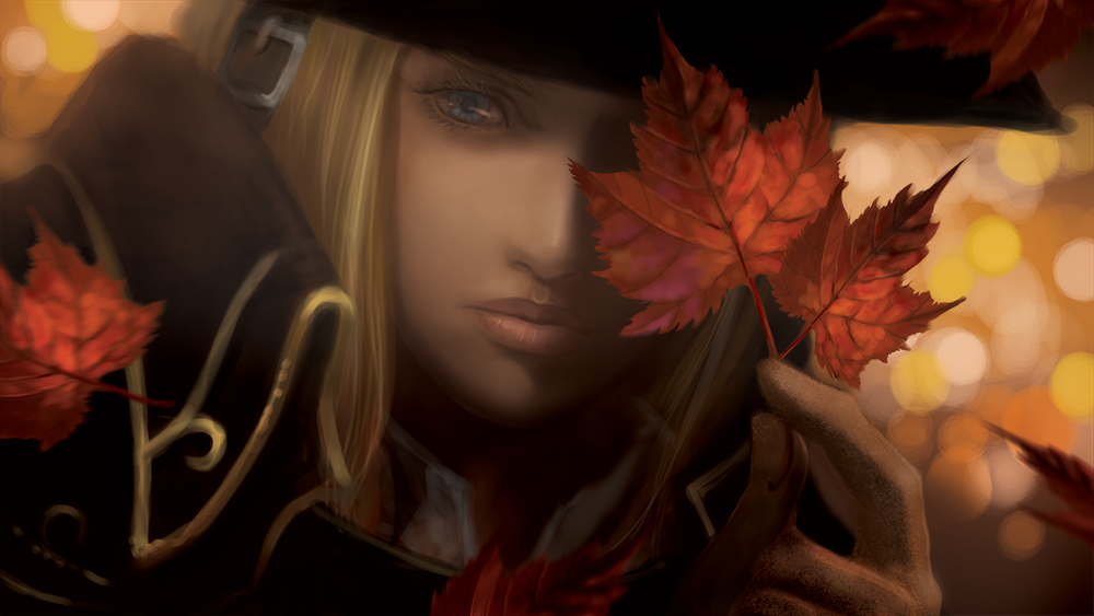 1girlautumn leavesblack coatblack hatblonde hairblue eyesblurrybokehclosed mouthcoatdepth of fieldexpressionlessfalling leaveshatholdingholding leafleaflipslong hairlooking at viewermaple leafportraitrealisticsolo