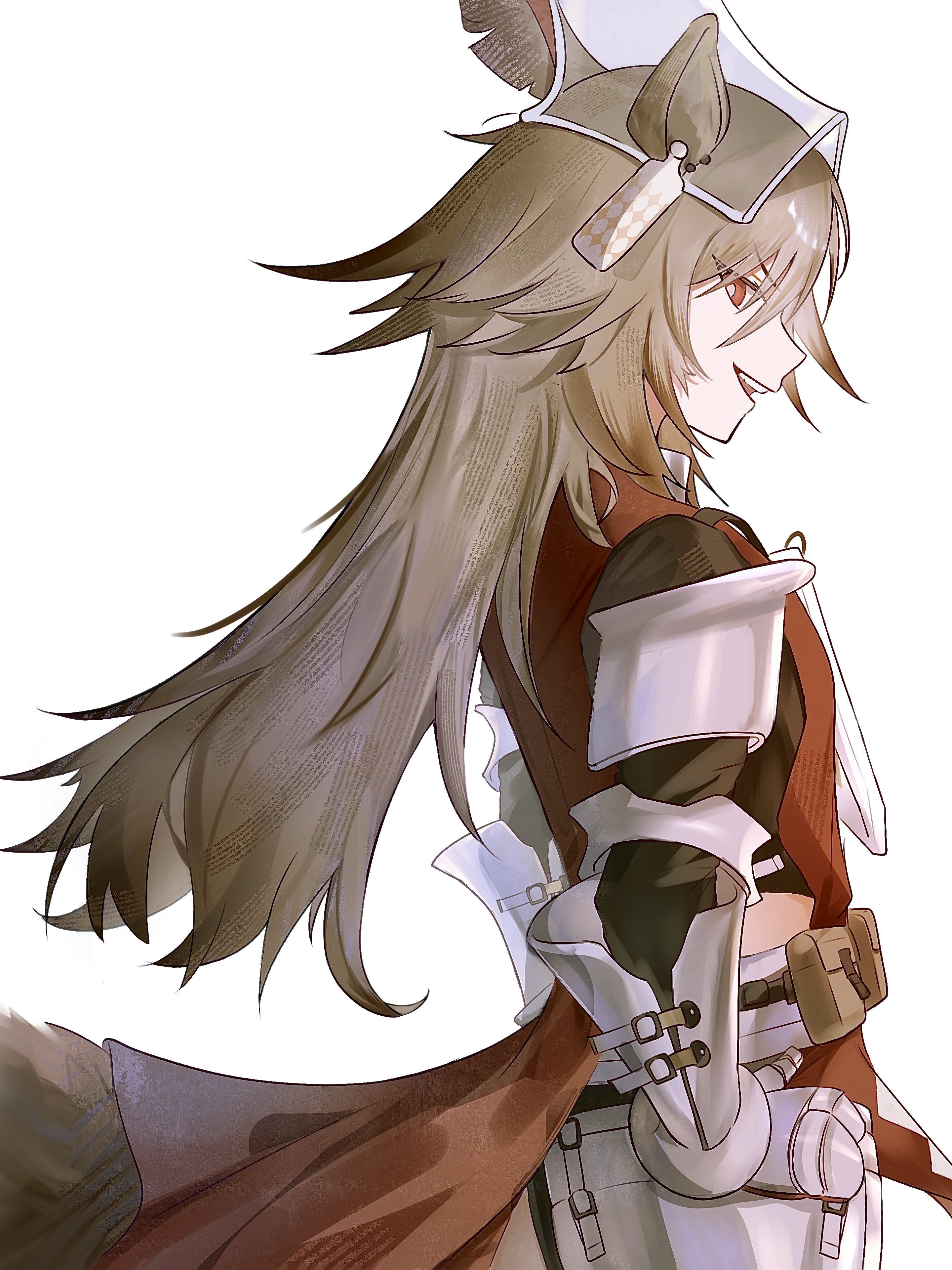 1girlanimal earsarmorbelt pouchbright pupilscowboy shotfacing to the sidegauntletsgrey hairhands on own hipshelmethip armorhorse earshorse girlhorse taillong hairlooking at viewermidriff peekopen mouthpatipatipati papouchred eyesred tunicshoulder armorsimple backgroundsmilesolotailteethtunicupper teeth onlyvambraceswhite background