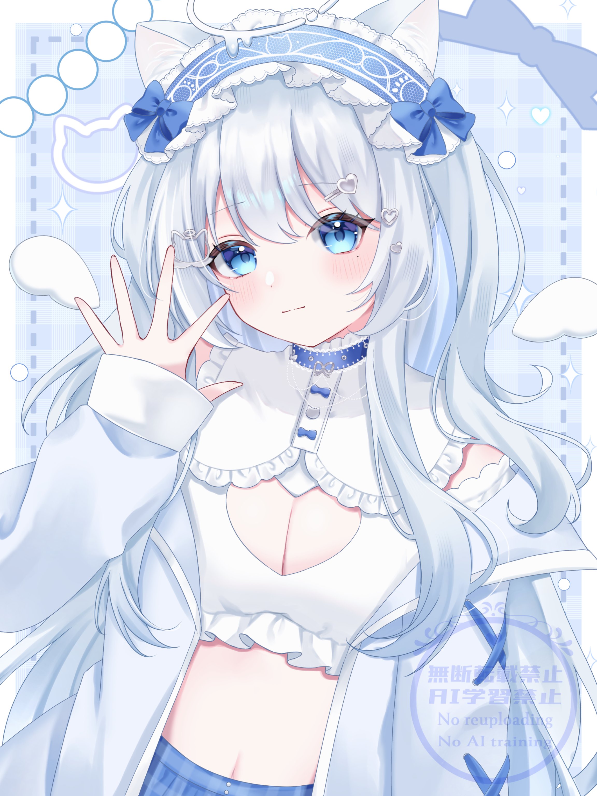 1girlanimal earsblue chokerblue eyesbreastscat earschokercleavagecleavage cutoutclosed mouthclothing cutoutcrop topfrilled shirtfrillshalohand upheaddressheart cutoutjacketlong hairlong sleeveslooking at viewermedium breastsmidriffmolemole under eyenavelnekone uyuoff shoulderopen clothesopen jacketshirtsleevelesssleeveless shirtsoloupper bodyvirtual youtuberwhite hairwhite jacketwhite shirt
