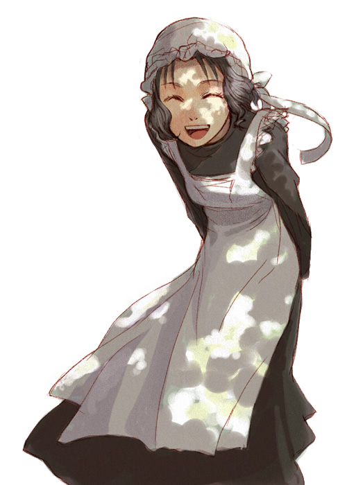 1girlapronarms behind backbonnetclosed eyesdappled sunlightfemale focussmilesolosun-dappledsunlight