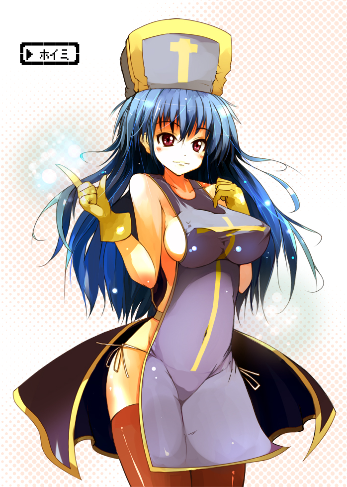 1girlapronblue hairblushbreastscovered erect nipplescovering privatesfemale focusgloveshatimpossible clothesimpossible shirtlarge breastslatexlong hairmitrenaked apronnaked tabardnude coverpantiesred eyesshirtside-tie pantiessideboobsolotabardthighhighsunderwear