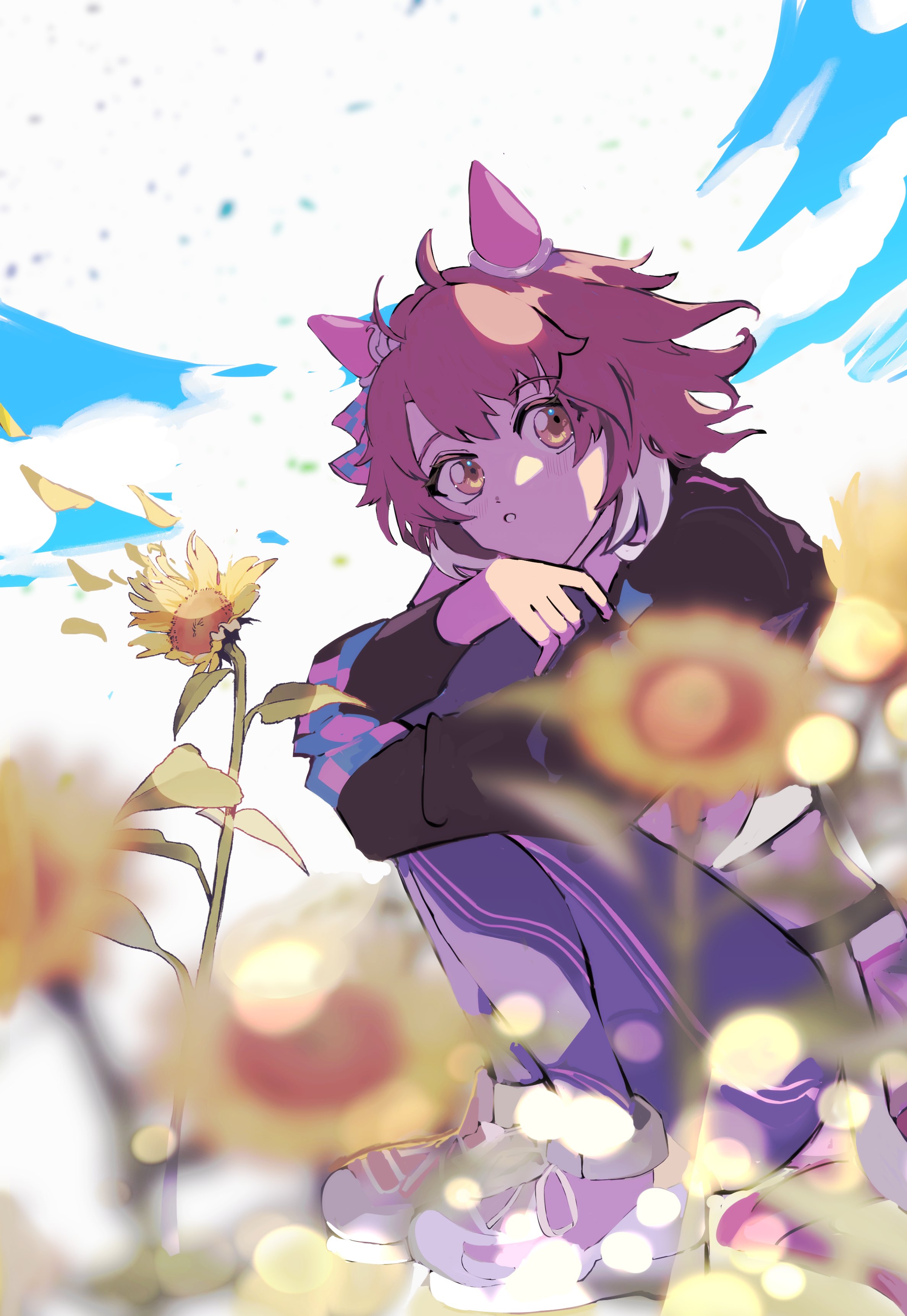 1girlahogeanimal earsblack shrugblue skybowbreastsbrown eyesbrown haircloudcropped shirtear coversear ornamentear ribbonflowerhair between eyeshissinikaiteruhorse earshorse girlhugging own legsknees upleggingsleggings under shortslong sleeveslooking at viewermulticolored hairpetalspink shirtpink shortsshirtshoesshortsshrug (clothing)skysolosquattingwhite hair