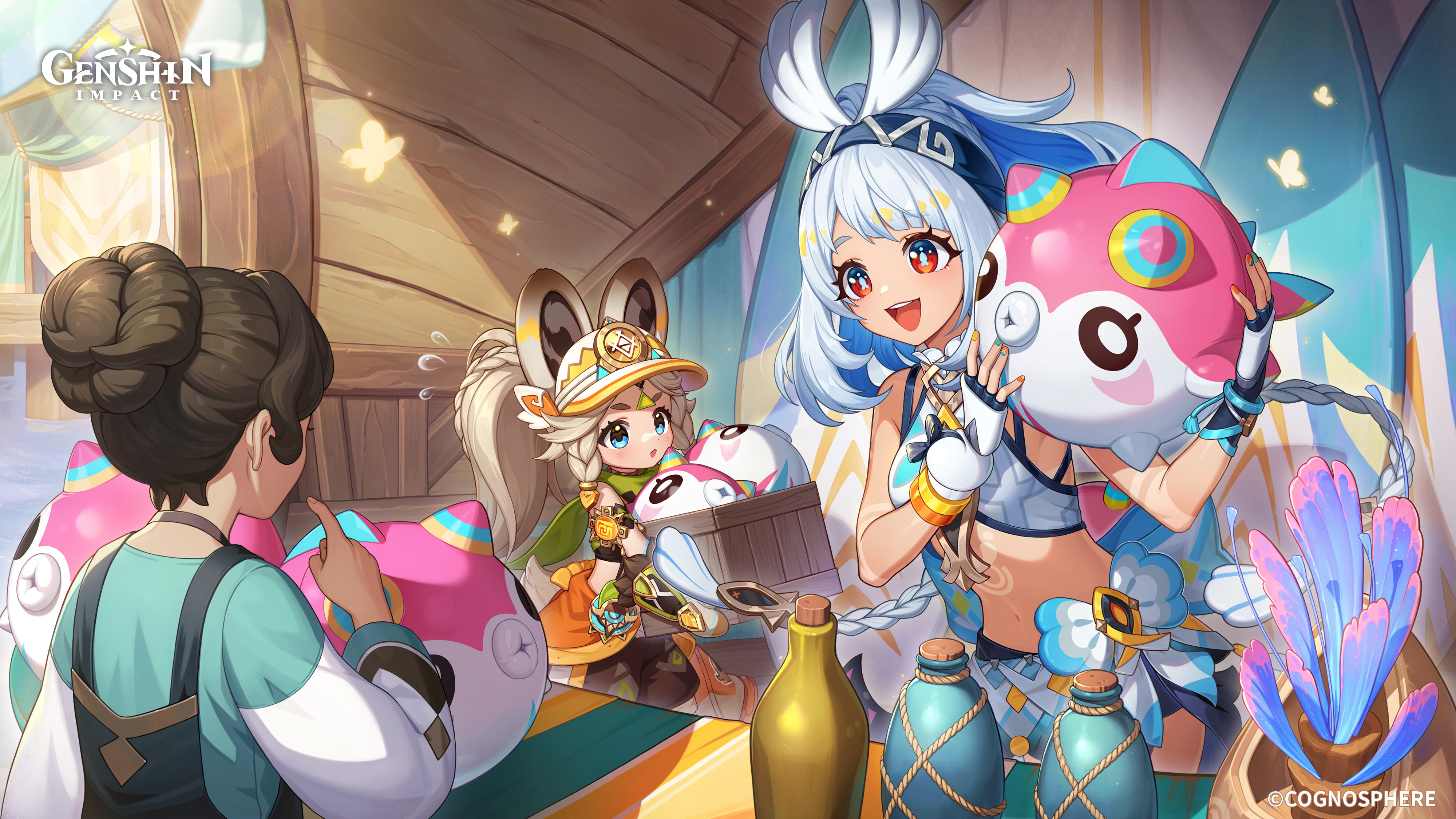 3girlsblue hairblue hairbandbody markingsbraidfingerless glovesfish-shaped pupilsflying sweatdropsgloveshairbandholdinglong hairlooking at anothermultiple girlsnavelopen mouthred eyessmilestomachsymbol-shaped pupilsteethtwin braidsupper teeth onlywhite gloves
