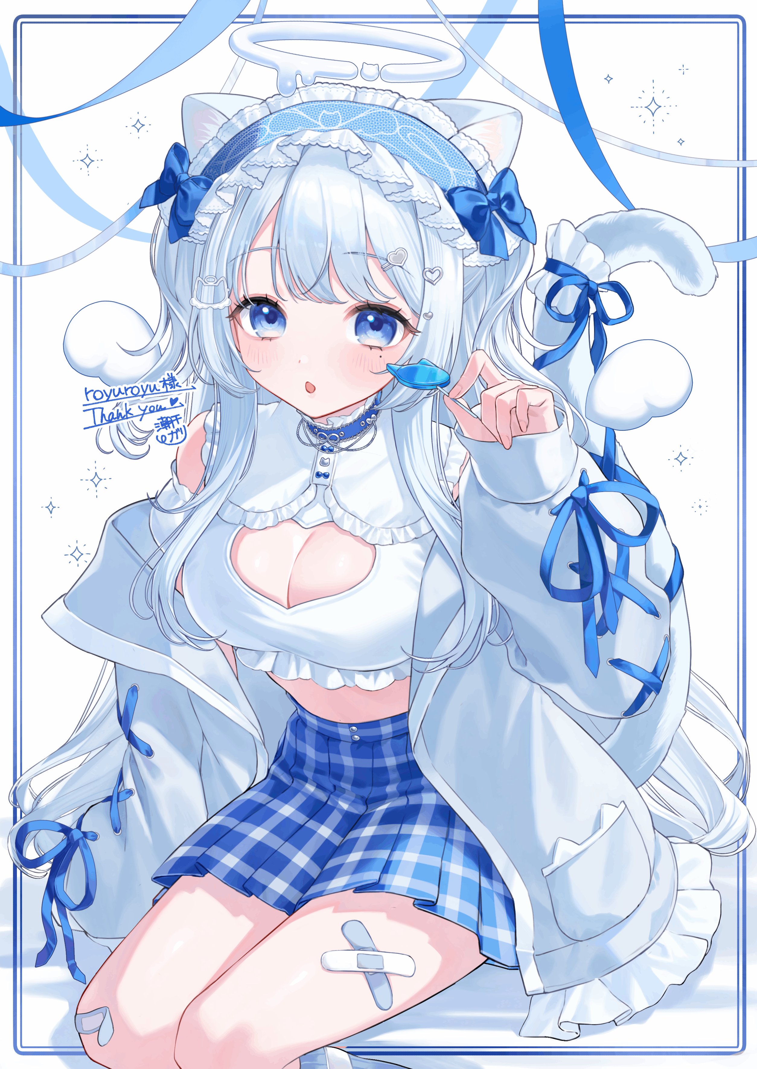 yamaura tamaki, striped, 1girl, breasts, female focus, large breasts, one eye closed, open mouth, panties, solo, thighhighs, twintails, underwear, v, v over eye, vertical stripes, waitress, white panties, white thighhighs
