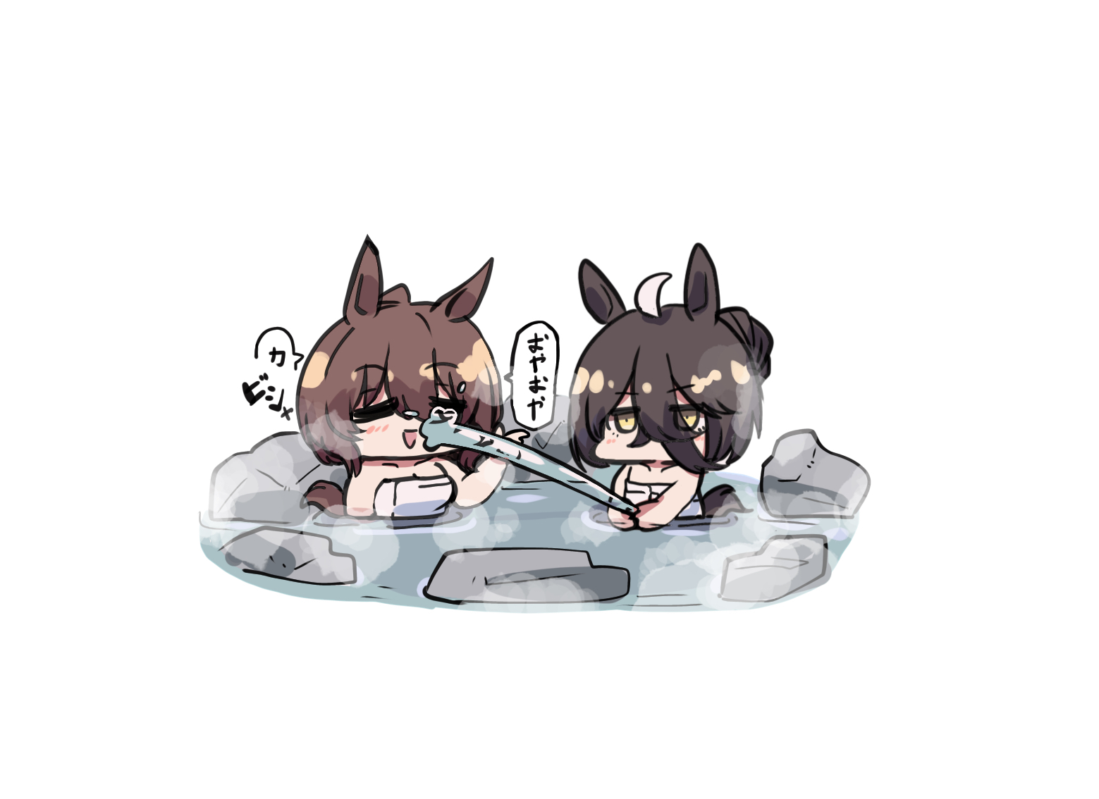:d2girlsahogeanimal earsbare armsbare shouldersblack hairblushbrown eyesbrown hairchibieyes visible through hairhair between eyeshair bunhand uphorse earshorse girlhorse tailmulticolored hairmultiple girlsnaked towelonsenopen mouthpartially submergedsmilesquirting liquidtailtoweltwo-tone hairwaterwhite backgroundwhite hair