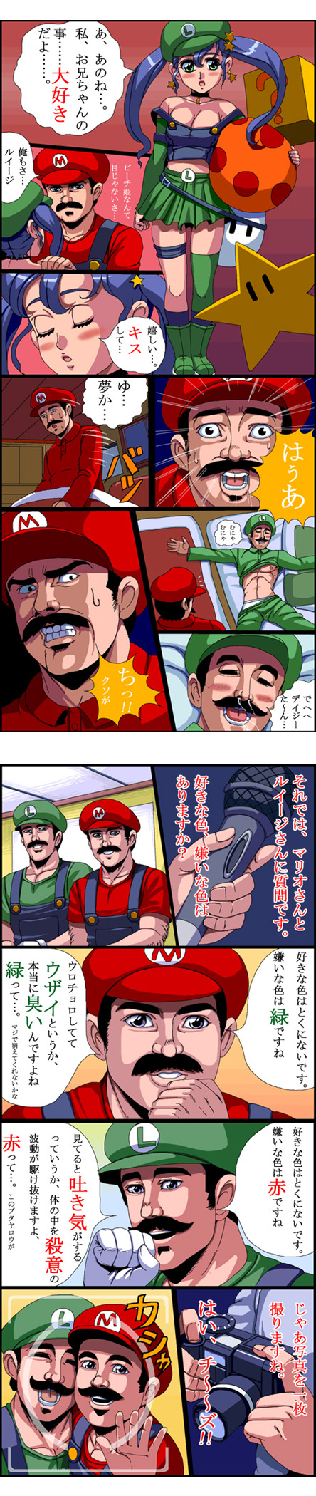 ? block1boy1girl2boysbeltblanketblue hairbootsbreastsbrown haircameracleavageclosed eyescomicdreamingearringsfacial hairgenderswapgenderswap (mtf)glovesgreen eyeshatincestjewelrylegbandmedium breastsmicrophonemultiple boysmushroommustacheoverallspajamasskirtsockssuper mushroomthighhighstwintailswaking up