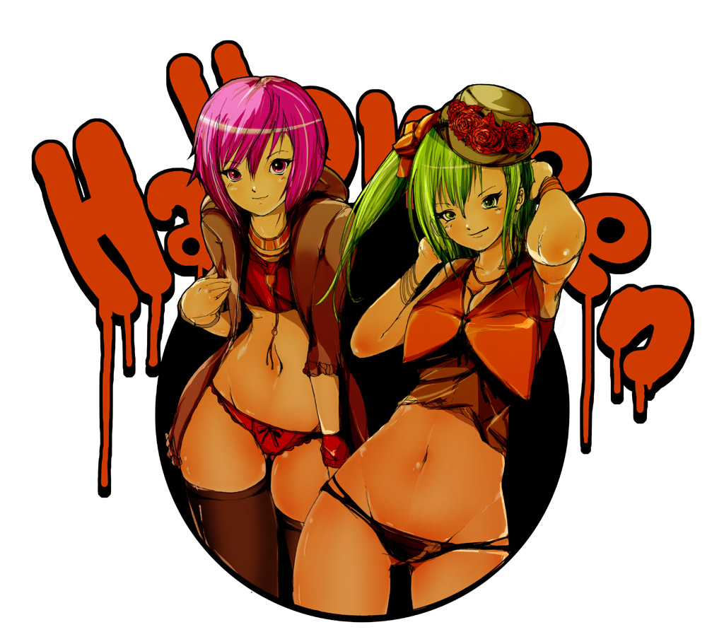 blushgreen eyesgreen hairhalloweenhatlacenavelpantiespink eyespink hairponytailthigh gapthighhighsthighsunderwear