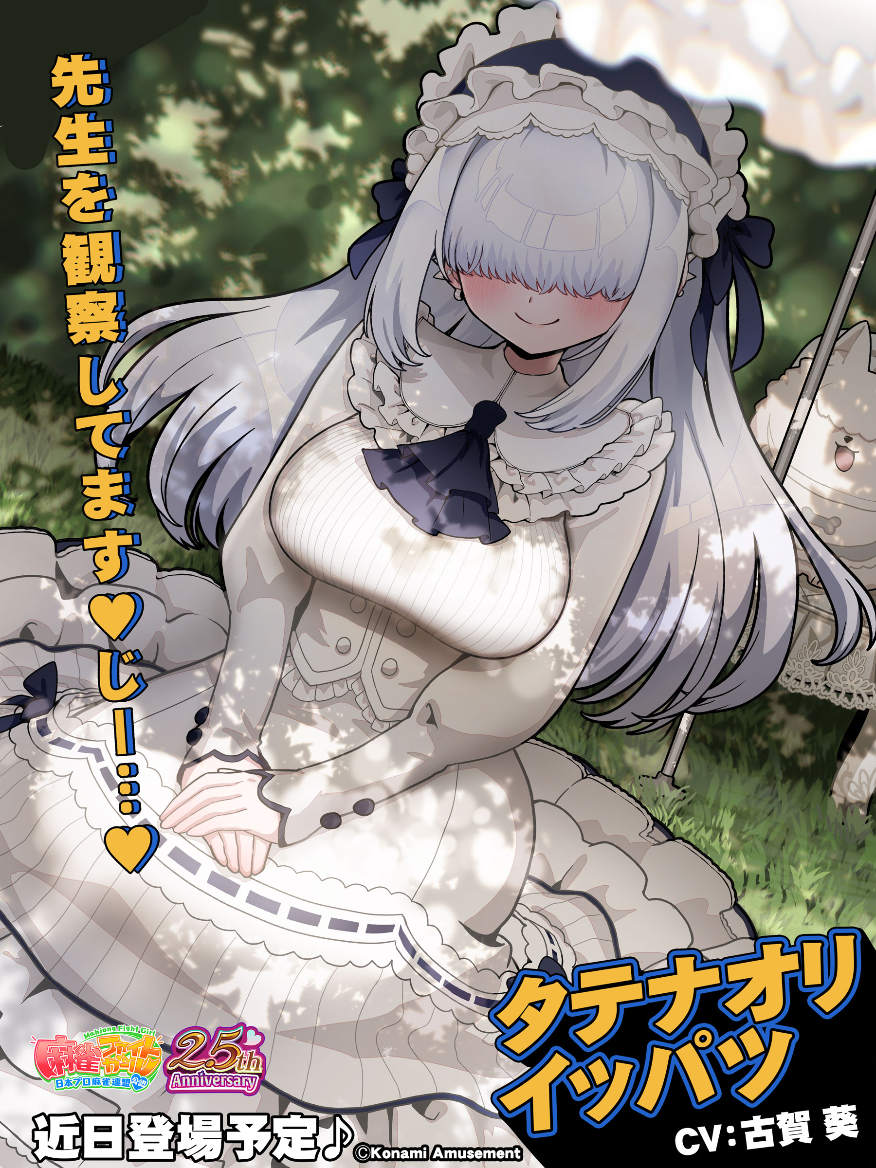 1girlascotblack ascotblunt bangsblushbreastscharacter namecopyright logocopyright namedappled sunlightdogdressdutch angleear piercingfrilled dressfrillshair over eyeshands on own kneeslarge breastslong hairlong sleevesmaid headdressparasolpiercingsidelockssittingsolosunlightumbrellawarizawhite dresswhite hair