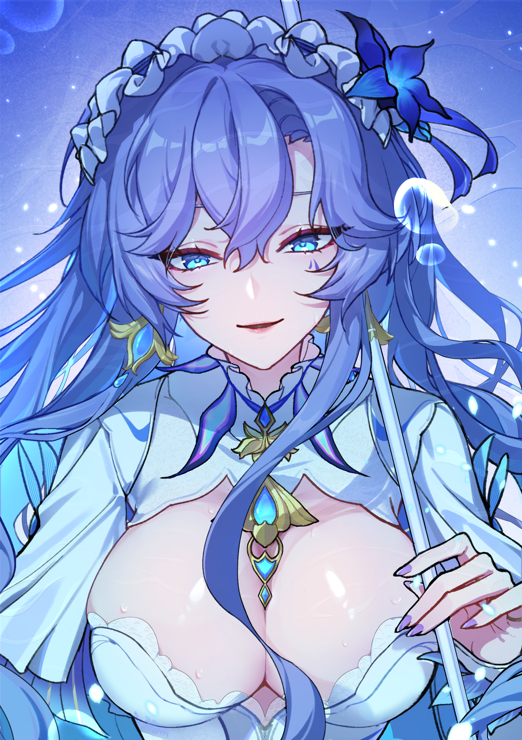 1girlblue eyesblue flowerblue hairbreastscolored inner hairearringsfacial markfingernailsflowerhair between eyeshair flowerhair ornamentheaddressholdingjewelrylarge breastslaroselong hairlooking at viewermark under eyemulticolored hairnail polishparted lipspurple hairpurple nailsshrug (clothing)smilesoloupper bodywhite shrug