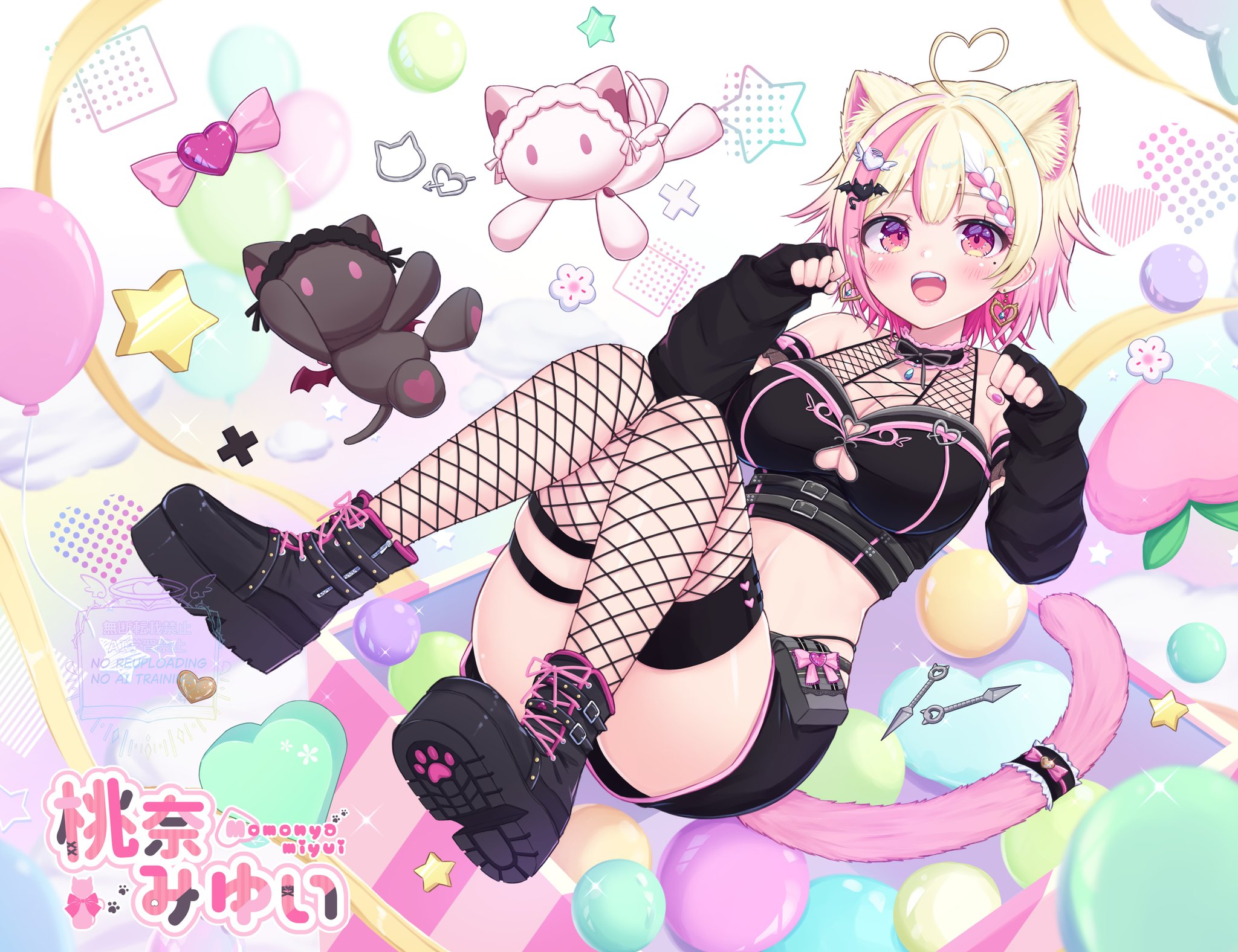1girlahogeanimal earsbare shouldersblack bootsblack shirtblack shortsblonde hairbootsbreastscat earscat tailcleavageclothing cutoutconvenient legcrop topdetached sleevesfingerless glovesfishnet thighhighsfishnetsglovesgradient hairheartheart ahogeheart cutoutlarge breastslegs uplong sleevesmidriffmolemole under eyemulticolored hairnavelopen mouthpaw posepink hairred eyesshirtshort hairshort shortsshortsskindentationsleevelesssleeveless shirtsmilesolostomachstreaked hairstuffed animalstuffed catstuffed toytailthigh strapthighhighstwo-tone hairunderboob cutoutvirtual youtuber