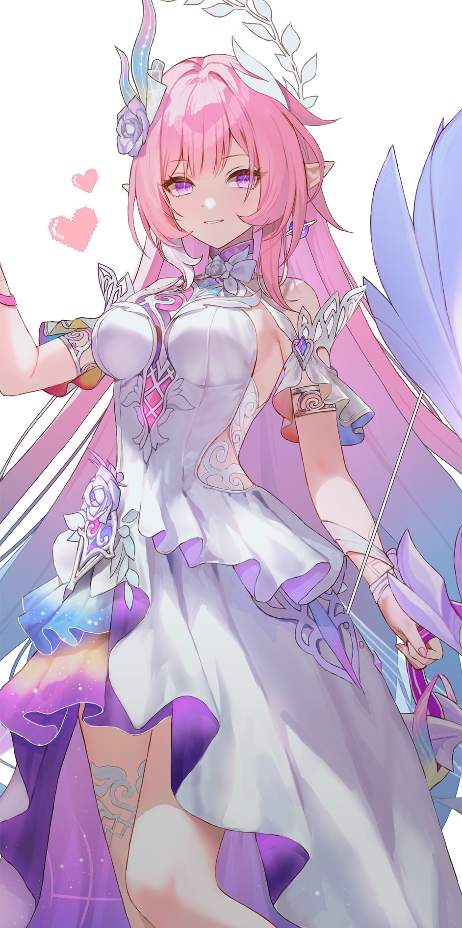 1girlarmletbare shouldersbow (weapon)breastsdiamond (shape)diamond-shaped pupilsdressearringsfingernailsflowerhair flowerhair ornamentheartholdingholding bow (weapon)holding weaponjewelrylong hairlooking at viewermedium breastsnail polishparted lipspink hairpink nailspointy earspurple eyespurple flowerpurple roserosesidelockssimple backgroundsmilesolosymbol-shaped pupilsvery long hairweaponwhite backgroundwhite dress