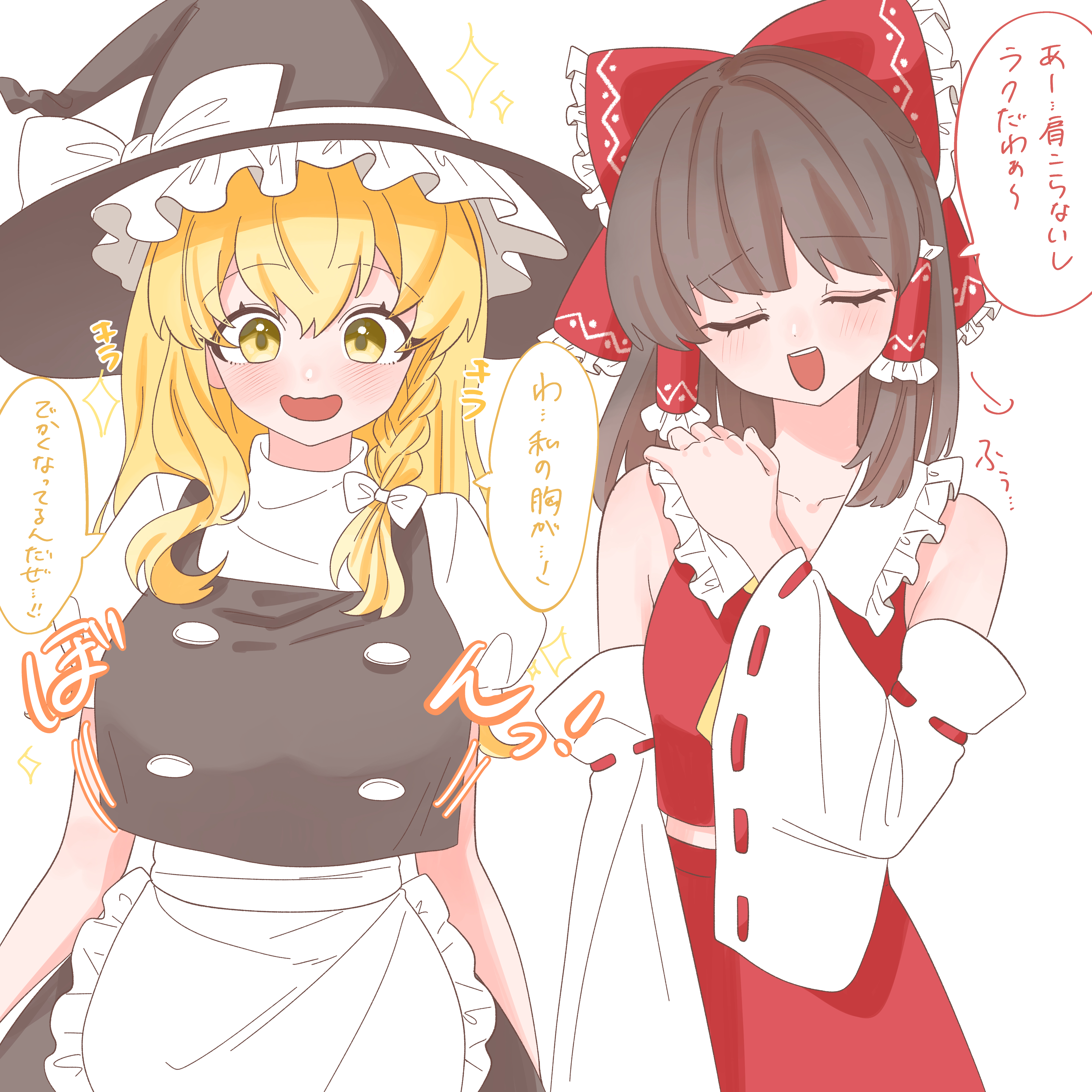 2girlsapronascotblack hatblack skirtblack vestblonde hairblushbowbraidbreast size switchbreastsbrown hairclosed eyesdetached sleevesfrilled bowfrilled hair tubesfrillshair bowhair tubeshand on own shoulderhathat bowlarge breastslong hairmultiple girlsopen mouthred bowred skirtribbon trimribbon-trimmed sleevesside braidsingle braidskirtskirt setsmilespeech bubblevestwaist apronwhite apronwhite bowwitch hatyellow ascotyellow eyes