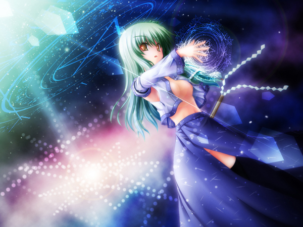 1girlblack thighhighsbreastscleavagedetached sleevesfemale focusgoheigreen hairjapanese clotheslong hairmagic circlemidriffmikono braopen clothesopen shirtpentagramshirtside slitskirtsolothighhighs