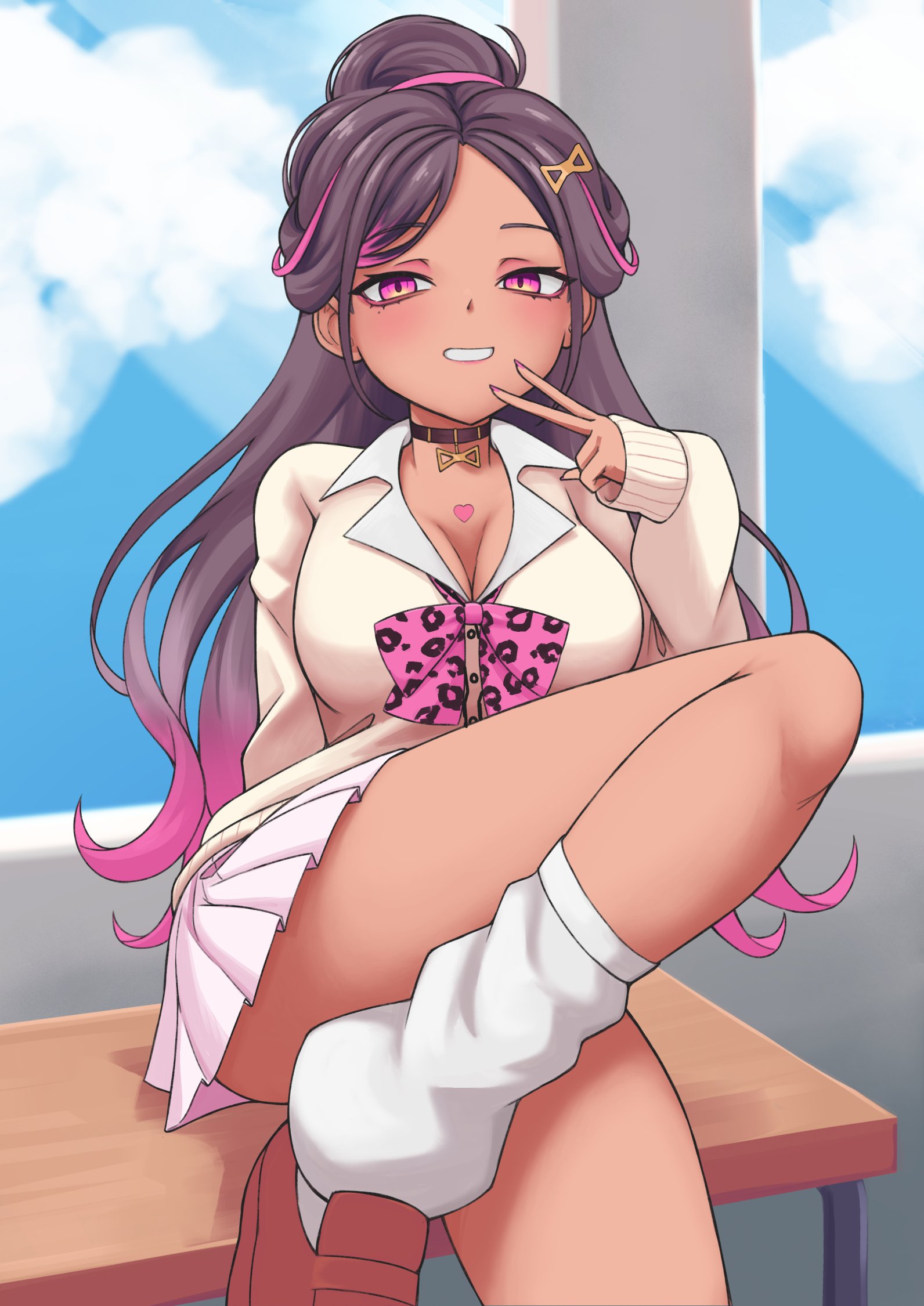 1girlanimal printblack hairbowbreastsbrown shoesdeskgradient hairgyaruhair ornamentheartleopard printlong hairloose socksmulticolored hairon deskpink bowpink eyespink hairpleated skirtschool deskshoessittingskirtsleeves past wristssockssolostreaked hairsweatertanvvirtual youtuberwhite socksyellow sweater