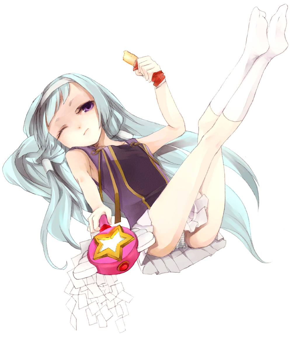 00s1girlblue hairblunt bangseatingfeetfemale focuslong hairminiskirtone eye closedpantiespleated skirtskirtsockssolostriped clothesstriped pantiesunderwearwandwhite skirtwink