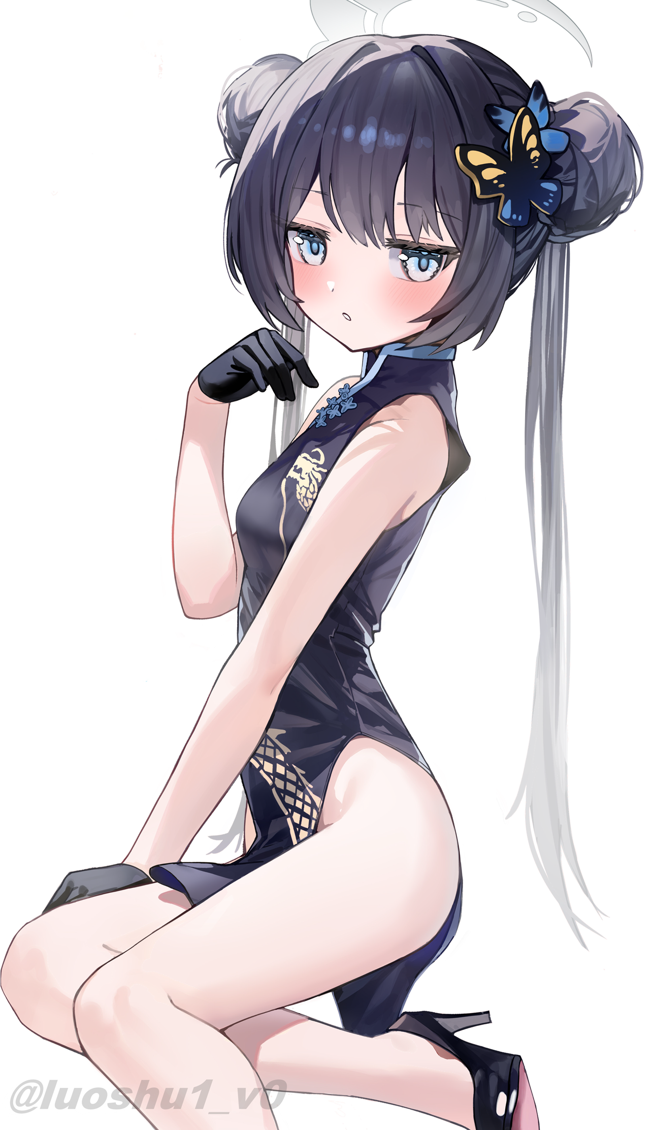 1girlblack dressblack glovesblack hairblue eyesbraidbraided bunbreastsbutterfly hair ornamentchina dresschinese clothesdouble bundragon printdressglovesgrey halohair bunhair ornamenthalohigh heelslong hairpelvic curtainprint dresssleevelesssleeveless dresssmall breastssolovery long hair